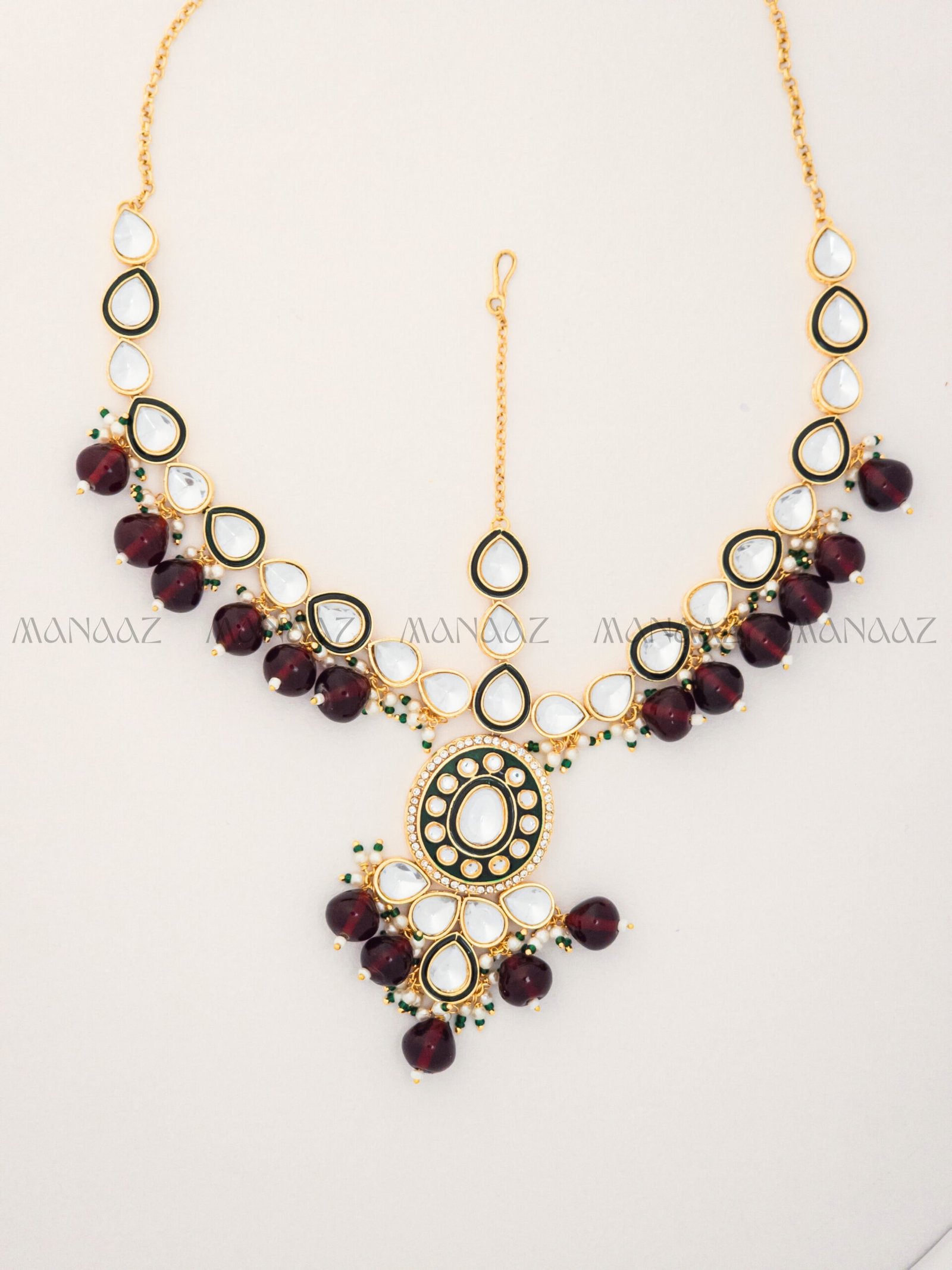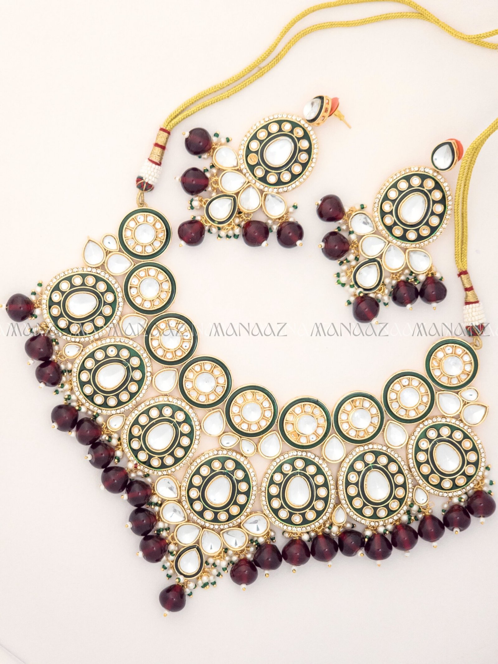 The Anahata Chakra Polki Semi Bridal Set is a magnificent choker necklace and earring ensemble that beautifully captures the essence of classic Mughal Kundan style with a bold, modern color palette. The set features prominent, luminous Polki-style imitation stones set in detailed golden rings and surrounds, some enhanced by a border of rich green enamel or stone work. The elegance is dramatically amplified by the fringe of deep maroon or garnet-red imitation beads, providing a stunning contrast to the clear Kundan. This exquisite set is a powerful statement piece, offering the royal appeal of heritage jewelry with a contemporary, high-fashion color edge.