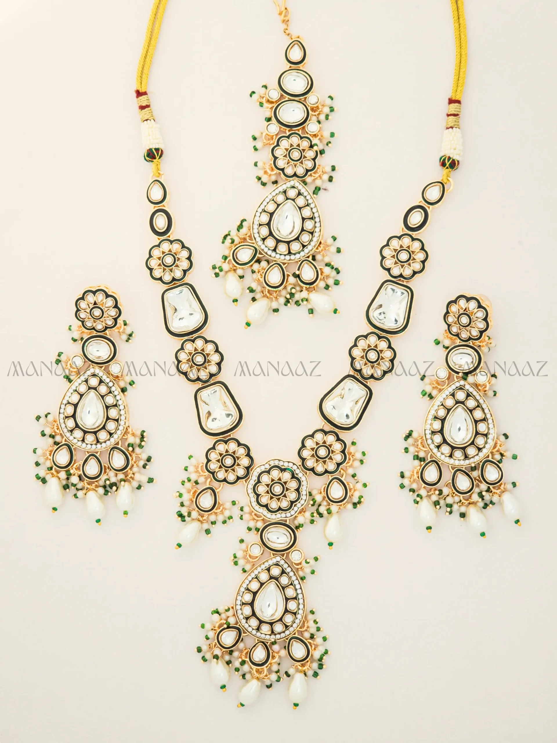 The Vanya Polki Necklace Set is a breathtaking, complete imitation jewelry set that exudes classic regal elegance with a fresh, contemporary touch. This magnificent set includes a long necklace, matching dangle earrings, and a matha patti (headpiece). It features large, luminous Polki-style imitation stones (faux Kundan) in traditional geometric shapes, interspersed with beautiful floral motifs accented by green enamel or stone work. The entire set is finished with delicate pearl and green bead clusters, giving it a soft, ethereal movement. It’s the ultimate statement for a bride or a grand ceremonial occasion, perfectly balancing opulence, nature-inspired grace, and traditional artistry.