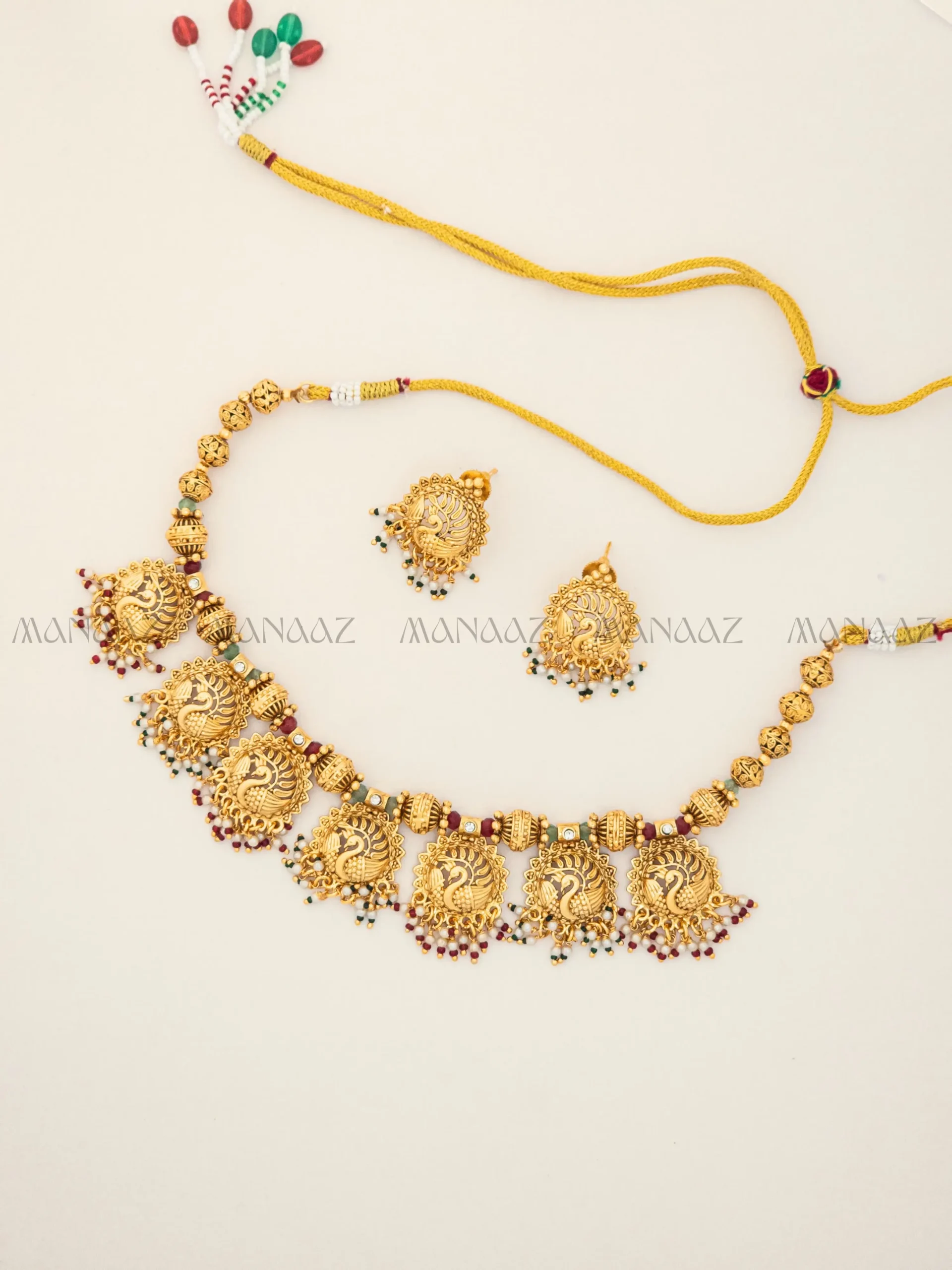 Mayura Virasat Choker Set is a beautiful imitation set that celebrates the timeless Peacock (Mayura) motif, a staple in Indian heritage jewelry. This stunning necklace and earring set features multiple sculpted peacock medallions, set in a rich, antique gold-tone finish. Each medallion is separated by polished gold-tone beads and subtle accent stones in traditional colors like red and green. The piece is finished with a delicate fringe of small beads and tiny pearl-like accents, adding subtle movement and artistry. This set offers a rich, authentic traditional look with a refined, wearable silhouette, making it perfect for cultural events and festive occasions.