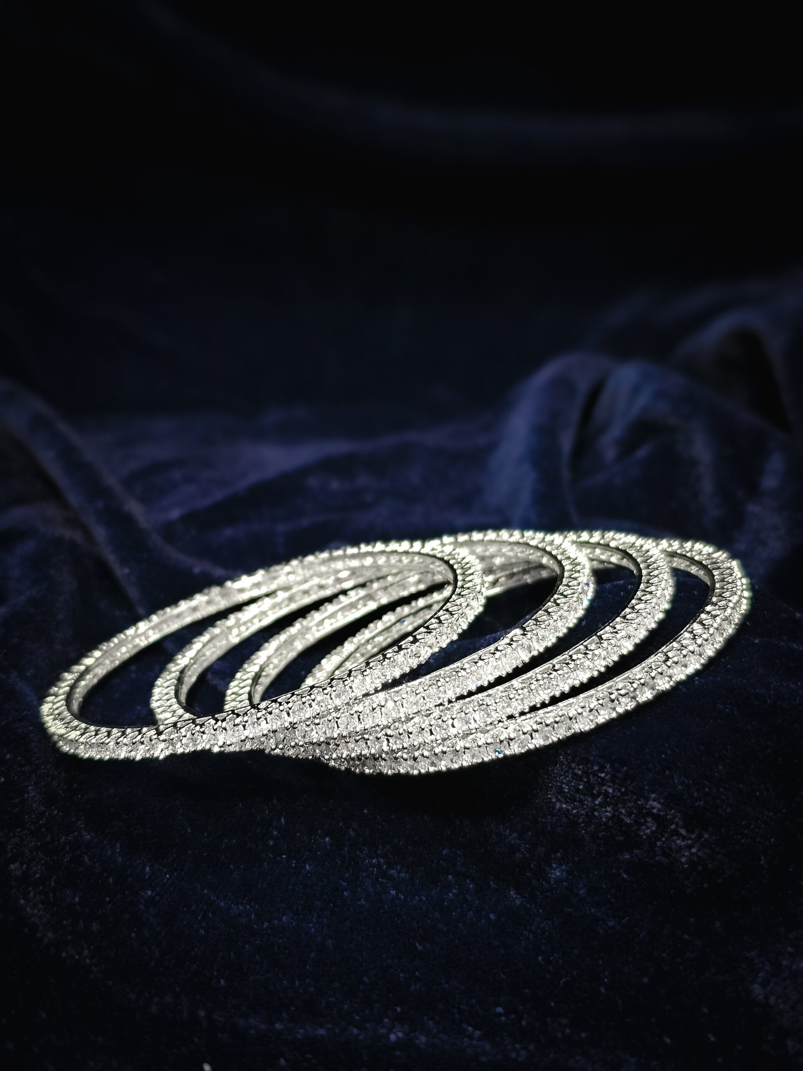 The Eternal Sparkle four-line Bangles beautifully blends traditional grace with contemporary sophistication. Designed with three slender rows of dazzling American diamonds, this bracelet reflects light from every angle, giving your wrist a radiant glow. Its sleek yet luxurious appeal makes it the perfect accessory for weddings, festive events, or evening parties.