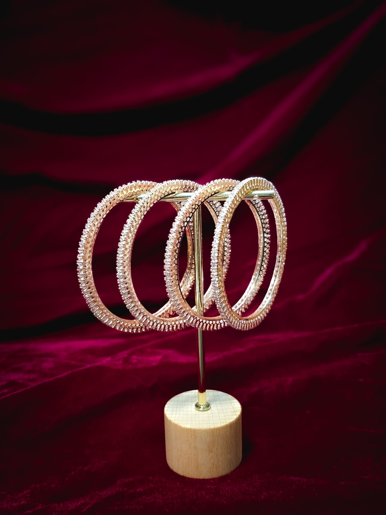Grace your wrists with the delicate charm of the Blush Royale Sparkling Bangles, where traditional artistry meets modern sophistication. Drenched in a soft rose-gold hue and lined with rows of shimmering stones, these bangles capture the essence of understated luxury. Whether paired with festive ethnic ensembles or contemporary evening wear, they add a radiant blush of glamour to every occasion.