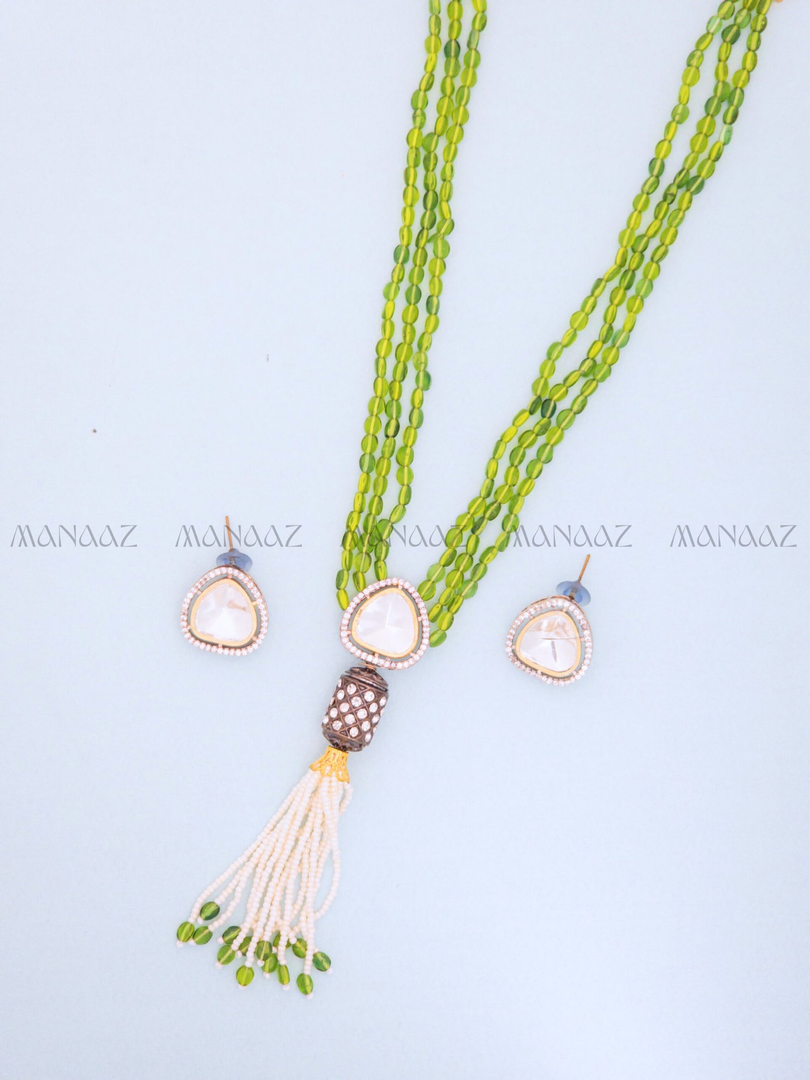 The Crystal Long Polki Set  is a graceful piece that beautifully blends the rustic charm of antique jewelry with the soft, ethereal glow of Polki-style imitation stones. This necklace features a fine gold-tone chain supporting a striking oval pendant. The center of the pendant showcases a large, luminous opaque white imitation stone (faux Polki), which is framed by intricate gold-tone metalwork, creating an heirloom-quality look. A fringe of delicate gold-tone drop accents hangs from the bottom, adding subtle movement. The perfectly matched stud earrings echo the oval motif and feature the same opaque white stone and three hanging drops, completing this charming and elegantly traditional ensemble.