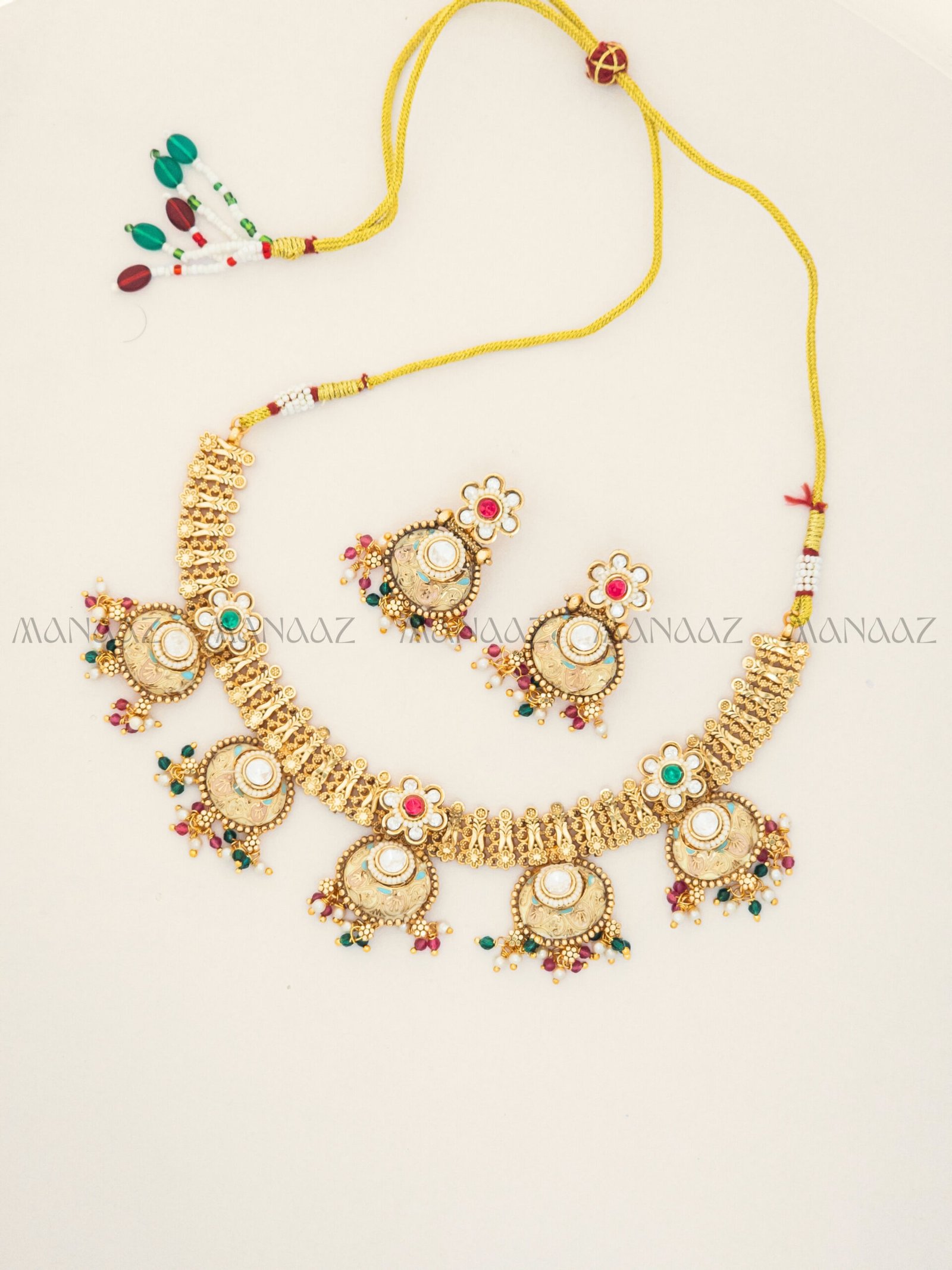 These Divya Heritage Gold Necklace are a magnificent imitation piece that brings the majestic artistry directly in our collection. These elaborate earrings feature a prominent, rendered in a rich, antique gold-tone. A beautifully detailed, dome-shaped hangs below, adorned with intricate, fine carvings and subtle texture. The entire piece is finished with a classic fringe of luminous imitation seed pearls around the base of the bell, providing a timeless contrast. These are the quintessential traditional earrings, offering unparalleled heritage grandeur and a sacred, opulent feel.