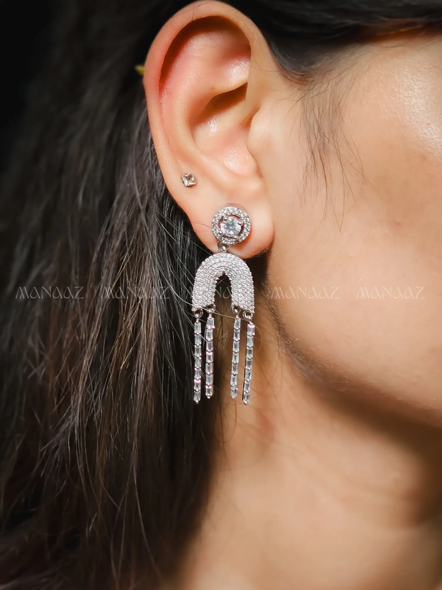 These captivating Arcadia Fringe Drop Earrings perfectly marry contemporary design with timeless sparkle. The elegant stud features a circular cluster of brilliant cubic zirconia, from which a graceful arc, also encrusted with shimmering stones, descends. Suspended from this arc are delicate fringes of baguette-cut American Diamonds, creating a fluid, cascading movement that beautifully catches the light. These earrings offer a chic, modern aesthetic with a touch of traditional glamour, making them versatile for both upscale events and adding a sophisticated edge to everyday fashion.