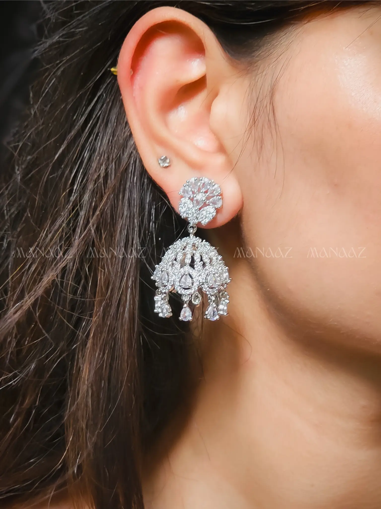 These captivating Diamond Bloom Jhumka Earrings offer a modern interpretation of a timeless traditional design. The elegant stud, crafted in a radiant floral motif, is completely encrusted with brilliant American Diamonds. Below, the classic jhumka bell shape is intricately detailed with sparkling cubic zirconia, creating a delicate, dome-like structure that gently sways. Dangling from its base are clear, pear-shaped and marquise-cut American Diamonds, adding a playful yet sophisticated fringe. These earrings are a perfect blend of intricate traditional craftsmanship and contemporary dazzle, ideal for festive celebrations, weddings, or any occasion where you want to make a sparkling statement.
