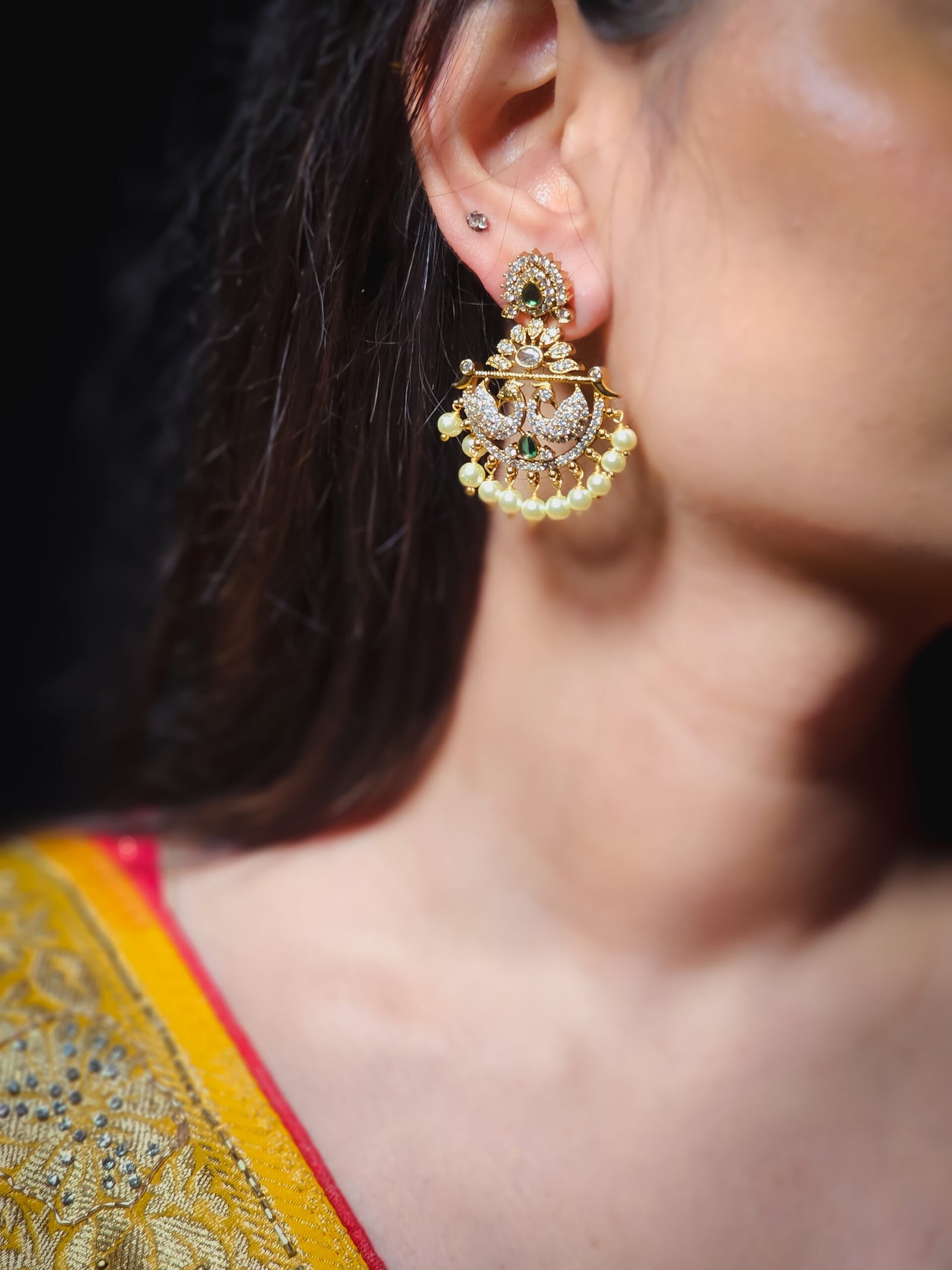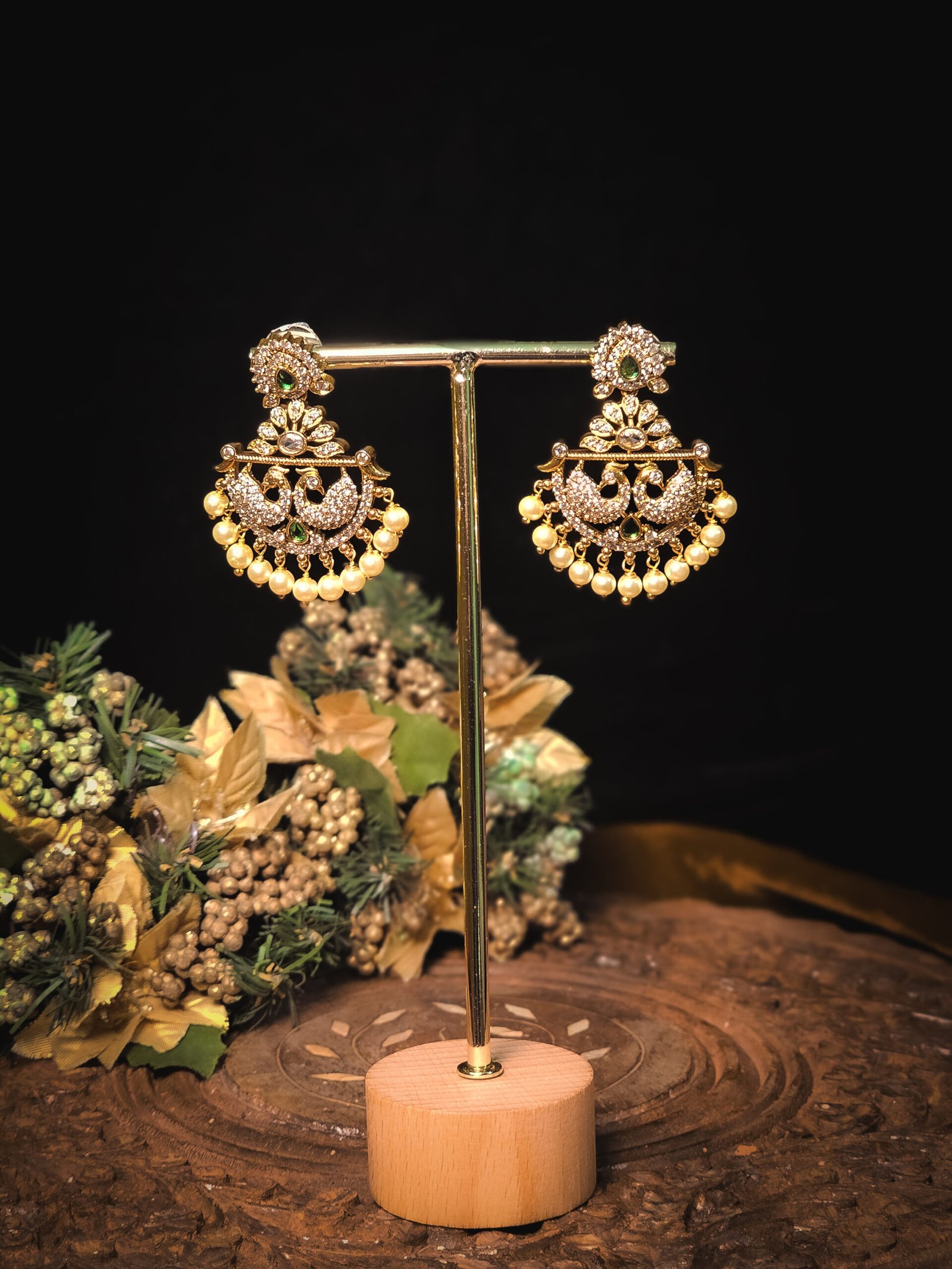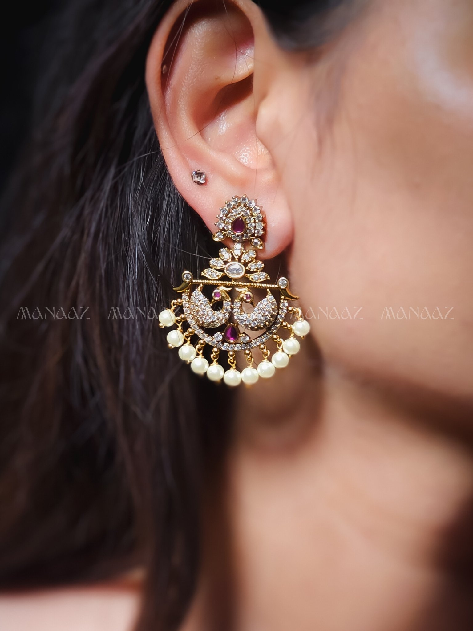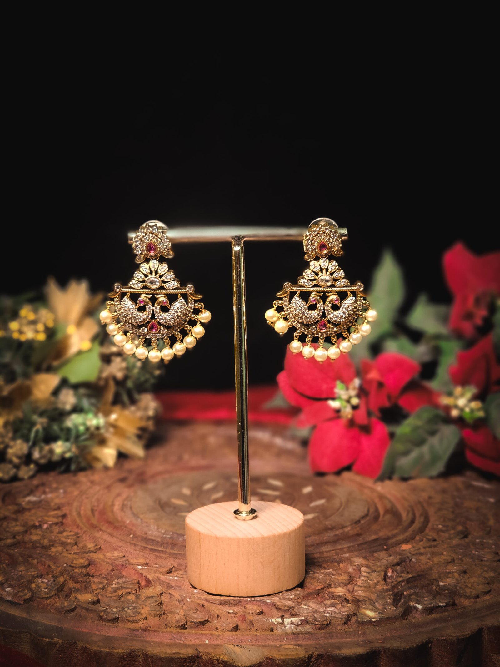 The Hansa-Mala Drop Earrings are a poetic celebration of traditional Indian design, blending antique finish with classic gemstone accents. The focal point is a charming depiction of a pair of Hansa (swans/geese), often seen in heritage jewelry, framed by brilliant white stones. The design beautifully merges a central mythological motif with an elegant cascade of imitation pearl drops along the base. Finished in an elegant antique gold tone and highlighted with deep ruby-red imitation stones, these earrings are a perfect balance of traditional richness and modern wearability, ideal for festive elegance and sophisticated ethnic ensembles.
