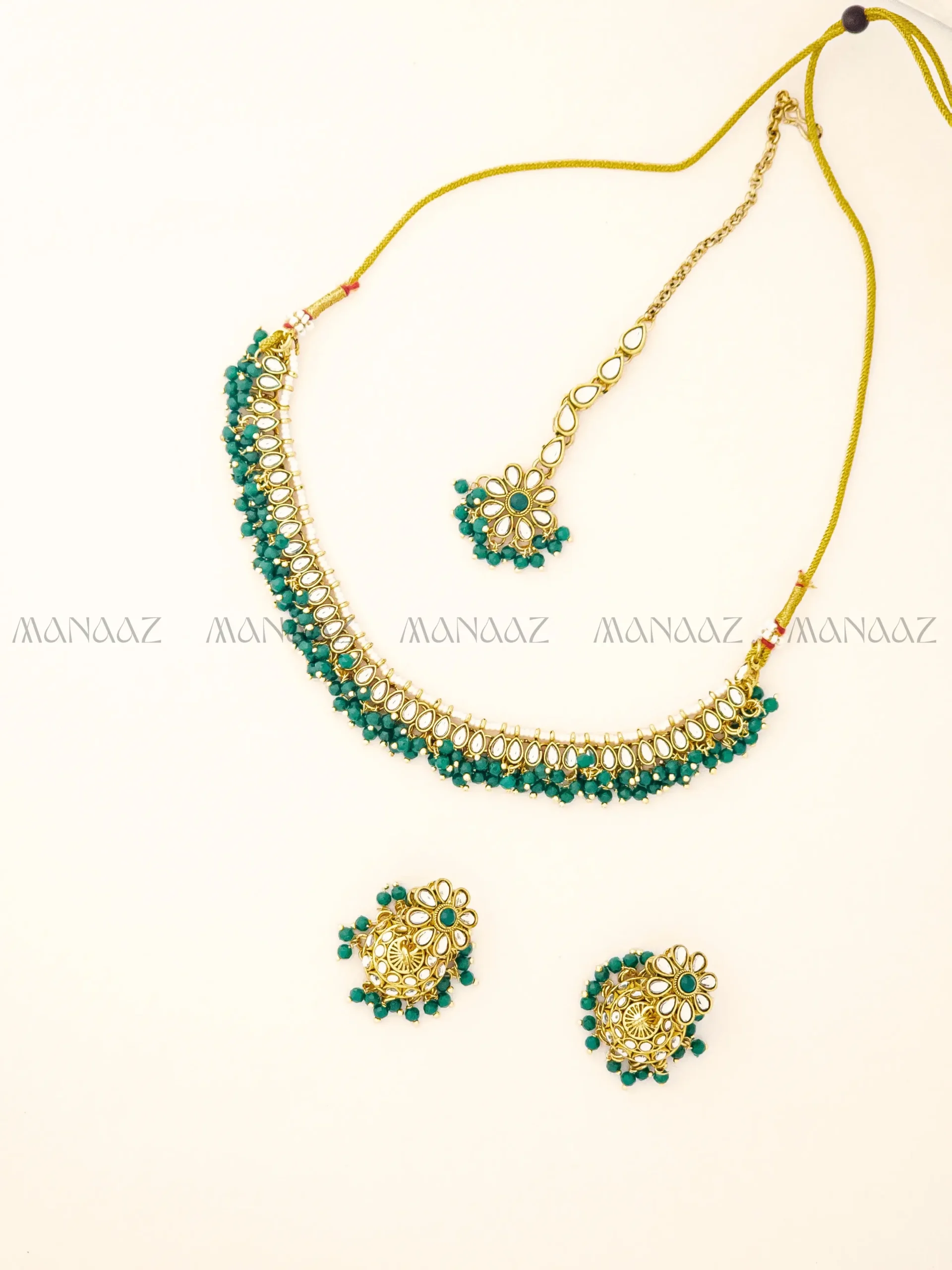 Celebrate graceful tradition with the Emerald Aangan Kundan Necklace Set, a beautifully balanced design that blends classic Indian craftsmanship with contemporary finesse. This elegant necklace features a single line of hand-set kundan stones, delicately bordered with emerald-green bead detailing, creating a soft yet striking royal look.