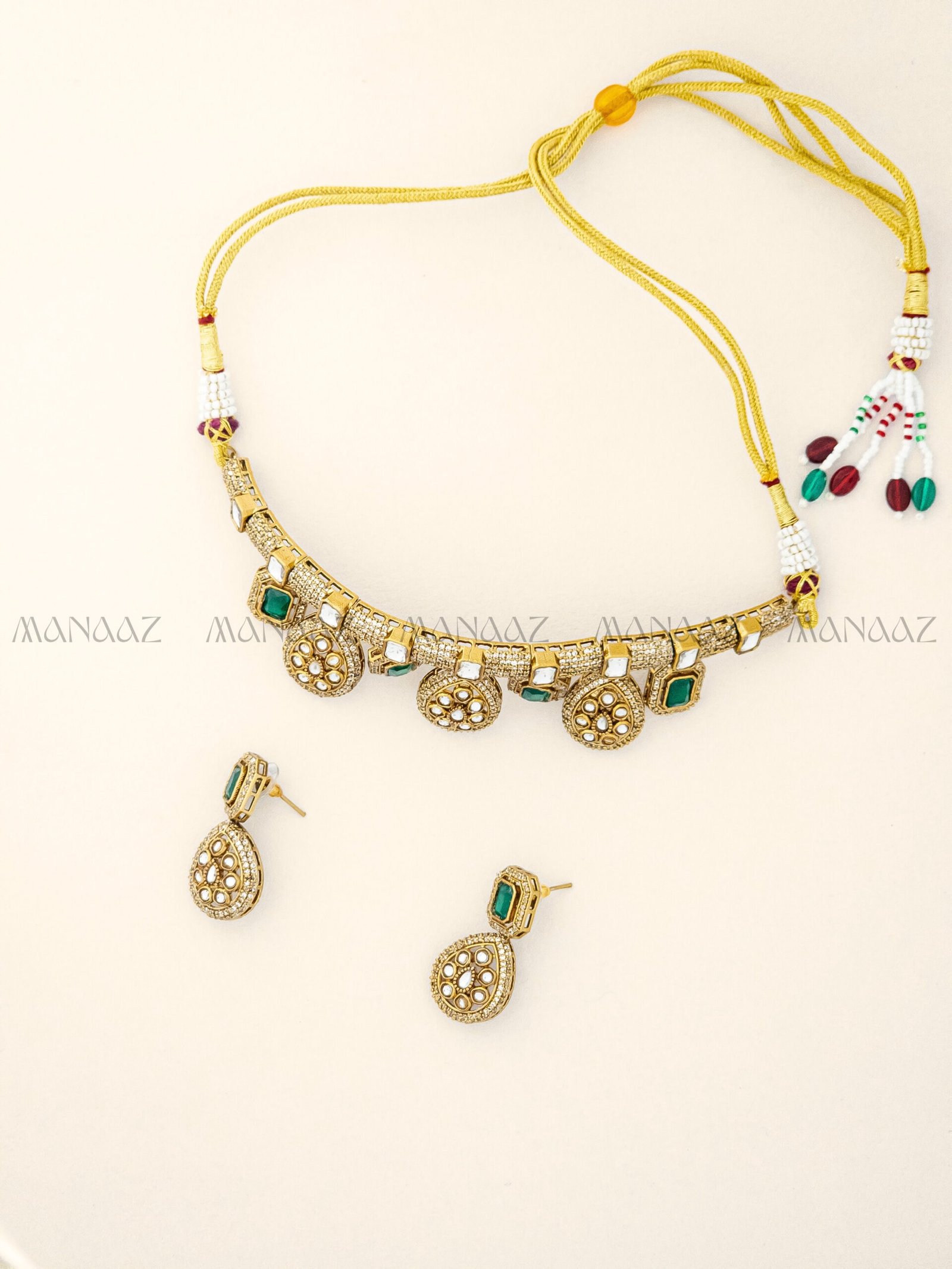 The Emerald Collar Set is a unique and classic piece that successfully blends the smooth, structured feel of a gold chain with the delicate sparkle of traditional pendant work. This close-fitting Collar Necklace features a thick, rounded woven gold-tone chain (Lari style) that sits gracefully around the neck. The necklace is accented by a single, central pendant drop: a teardrop-shaped emerald-green imitation stone surrounded by opaque white Polki-style imitation stones (faux Kundan) and small imitation pearl drops. The set is completed with perfectly matched, elaborate drop earrings that feature the exact same emerald, Polki, and pearl drop motif. This ensemble offers a refined and unique statement, blending the antique feel of the woven chain with the classic beauty of colored stone drops.