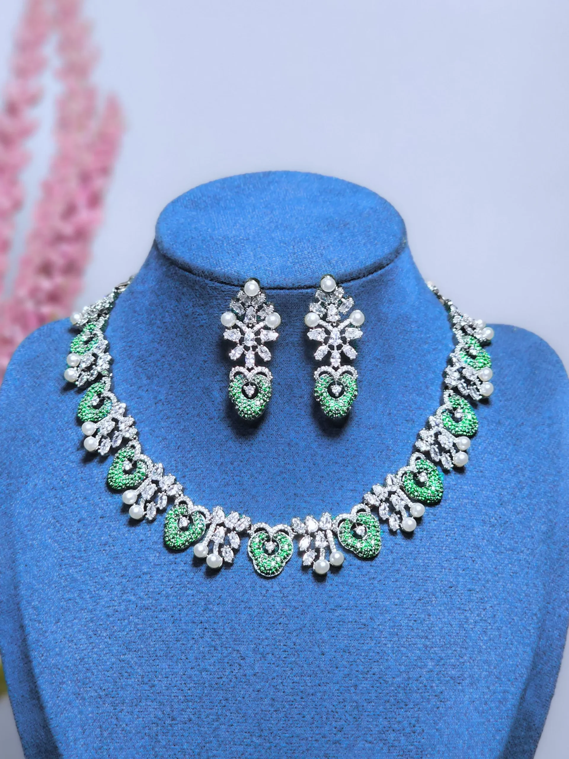 Emerald Heart Nano AD Necklace Set for women, a lightweight imitation jewellery for party wear, wedding functions and modern ethnic outfits.