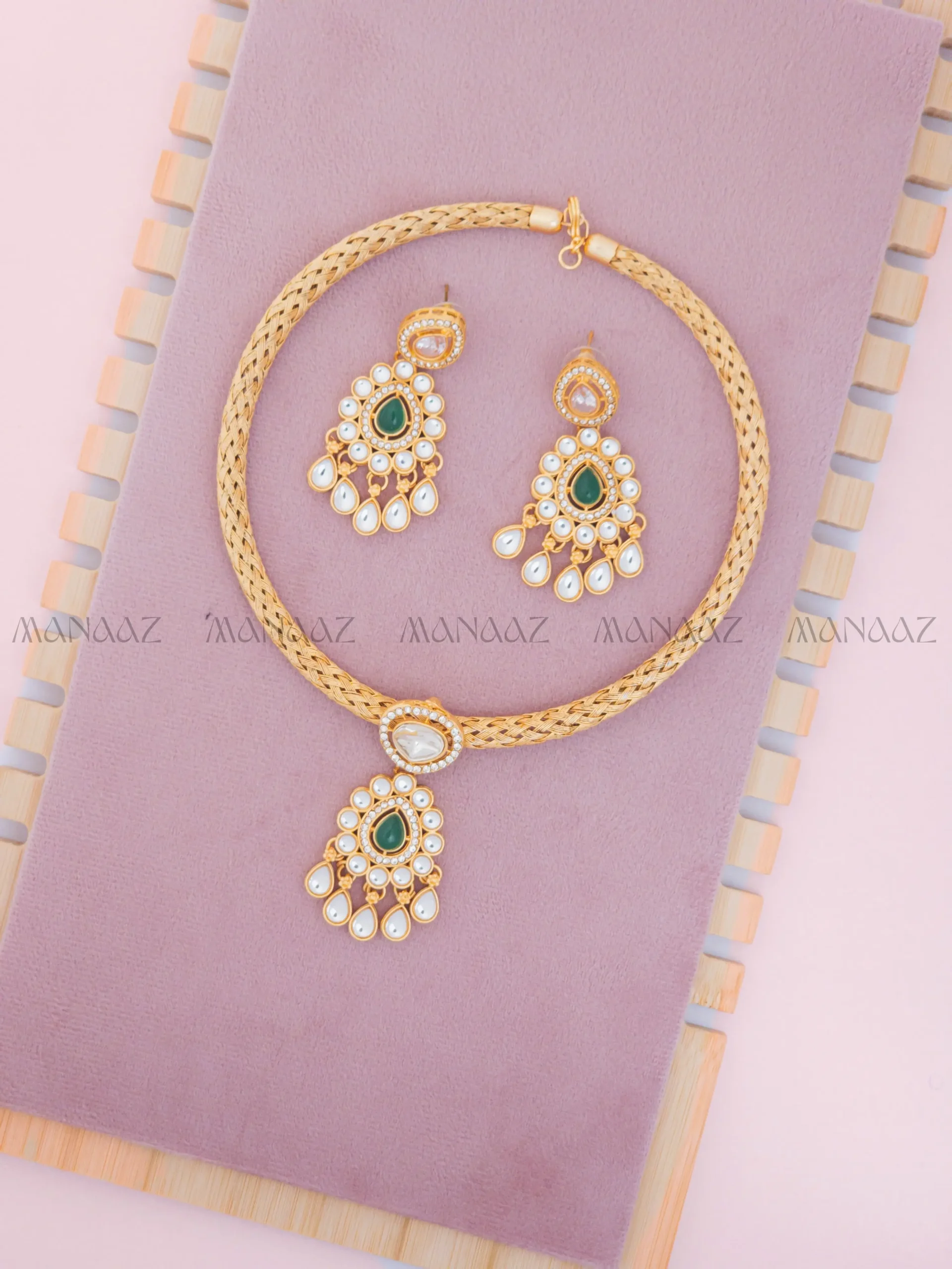 The Harit Mani Hasli Set is a regal piece that beautifully blends the bold structure of a traditional Hasli necklace with the soft luster of pearls and the striking color of emerald green. The necklace features a thick, rigid, yet flexible tubular gold-tone chain that rests elegantly on the collarbone, providing a substantial, heirloom quality. The centerpiece is a prominent drop pendant featuring a top oval Polki-style stone and a bottom circular motif showcasing a vibrant emerald-green imitation stone at its heart. This centerpiece is framed by sparkling accents and a beautiful, tiered fringe of imitation pearl drops, adding traditional movement. The set is completed with perfectly matched, elaborate drop earrings that mirror the pendant’s green and white motif and feature the same pearl fringe. This set offers a structured, royal, and refined look, perfect for making a sophisticated statement at any grand event.