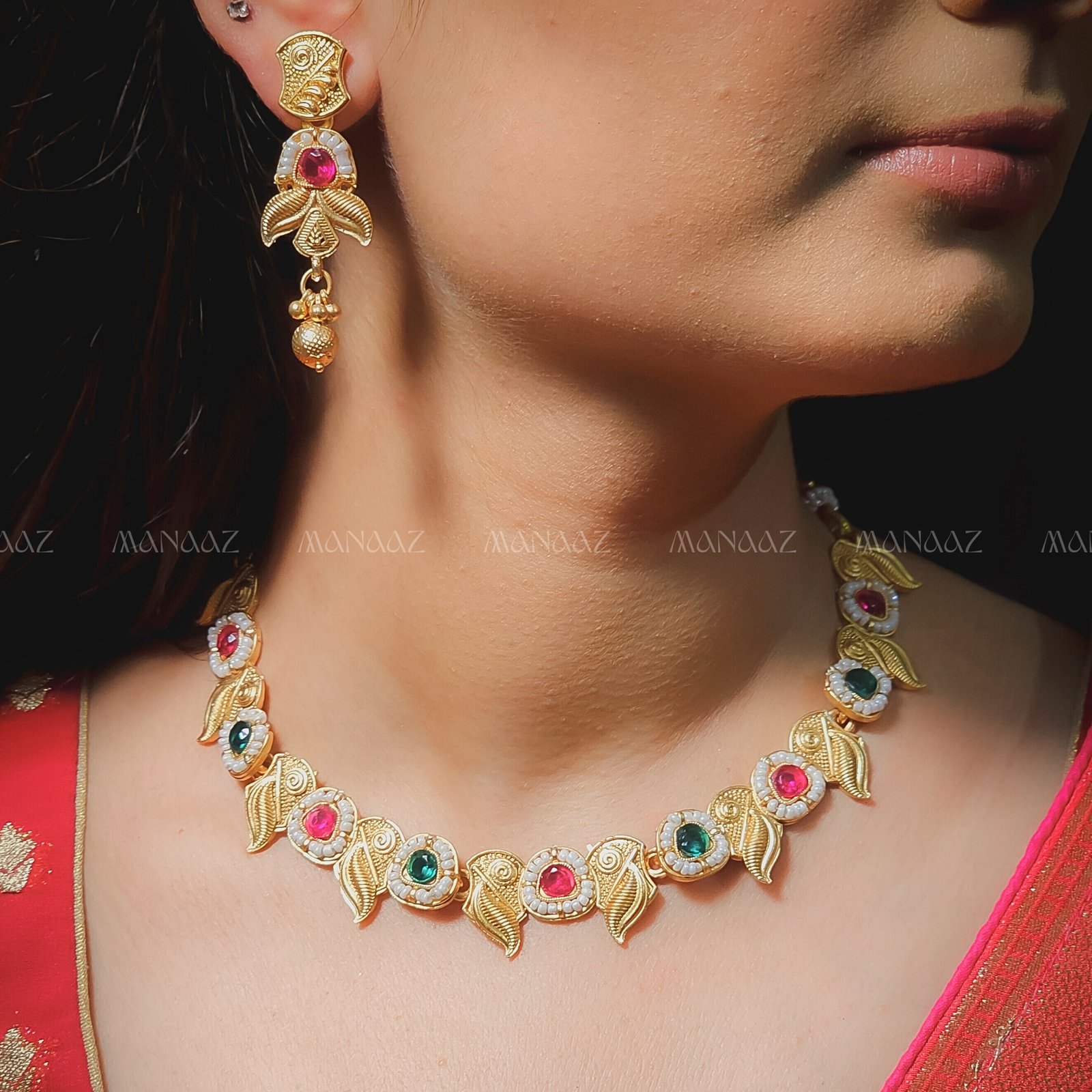 This eye-catching Antique Leaf & Stone Embellished Choker Set is an Antique Gold-Plated Choker featuring a light, flexible design with alternating leaf and traditional stone-setting motifs. It has a rich antique finish and is brightly accented with a mix of traditional Kemp Stones in Ruby Red and Emerald Green, alongside small pearl and clear stone details. This lightweight imitation set, which includes the choker and matching earrings, is adjustable and perfect for adding a touch of vibrant, traditional color to your ensemble for daytime events or small functions.