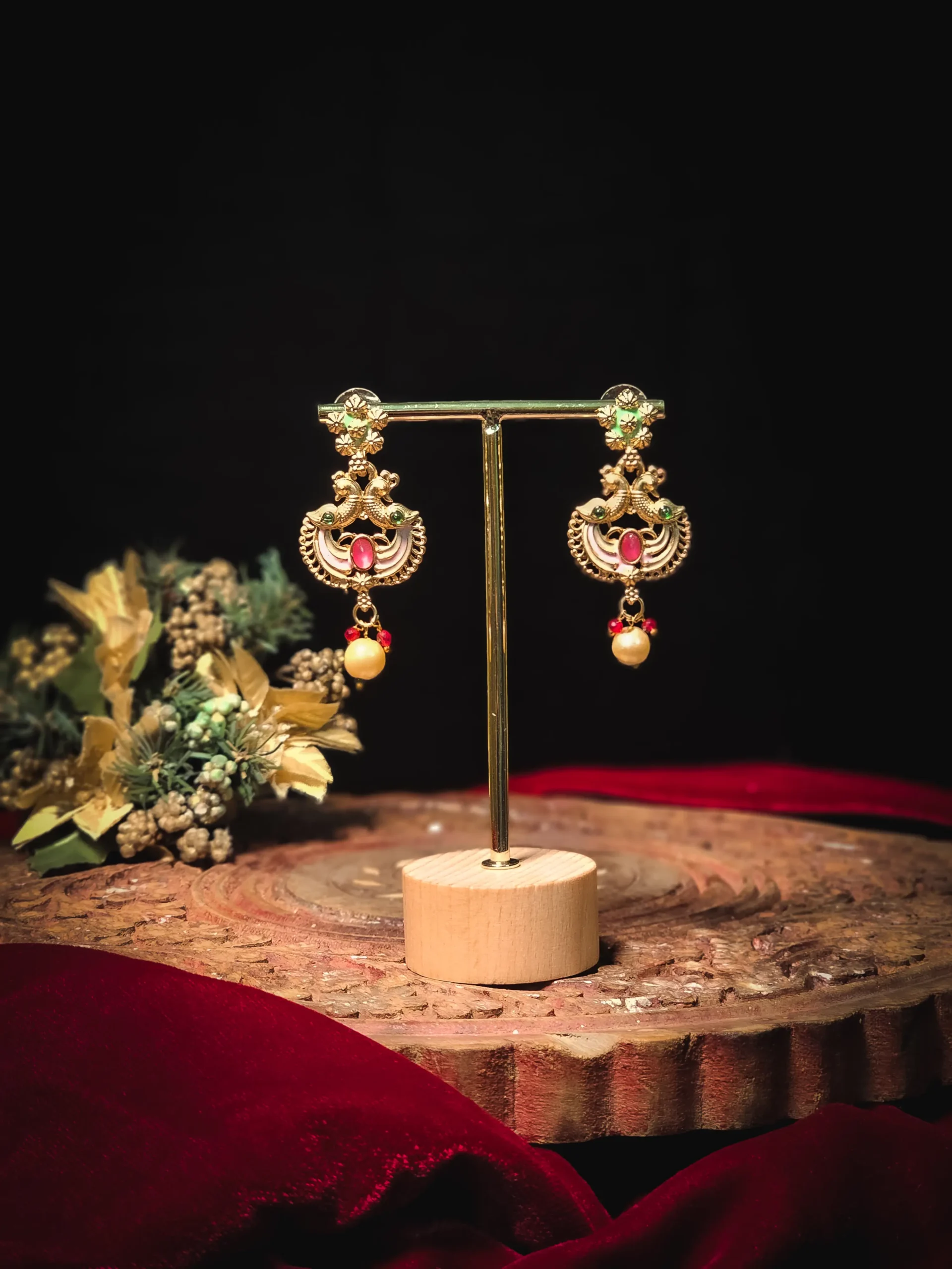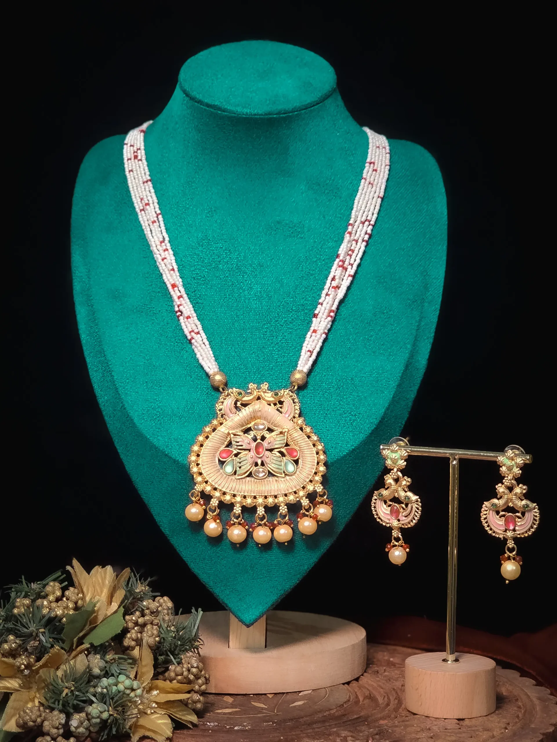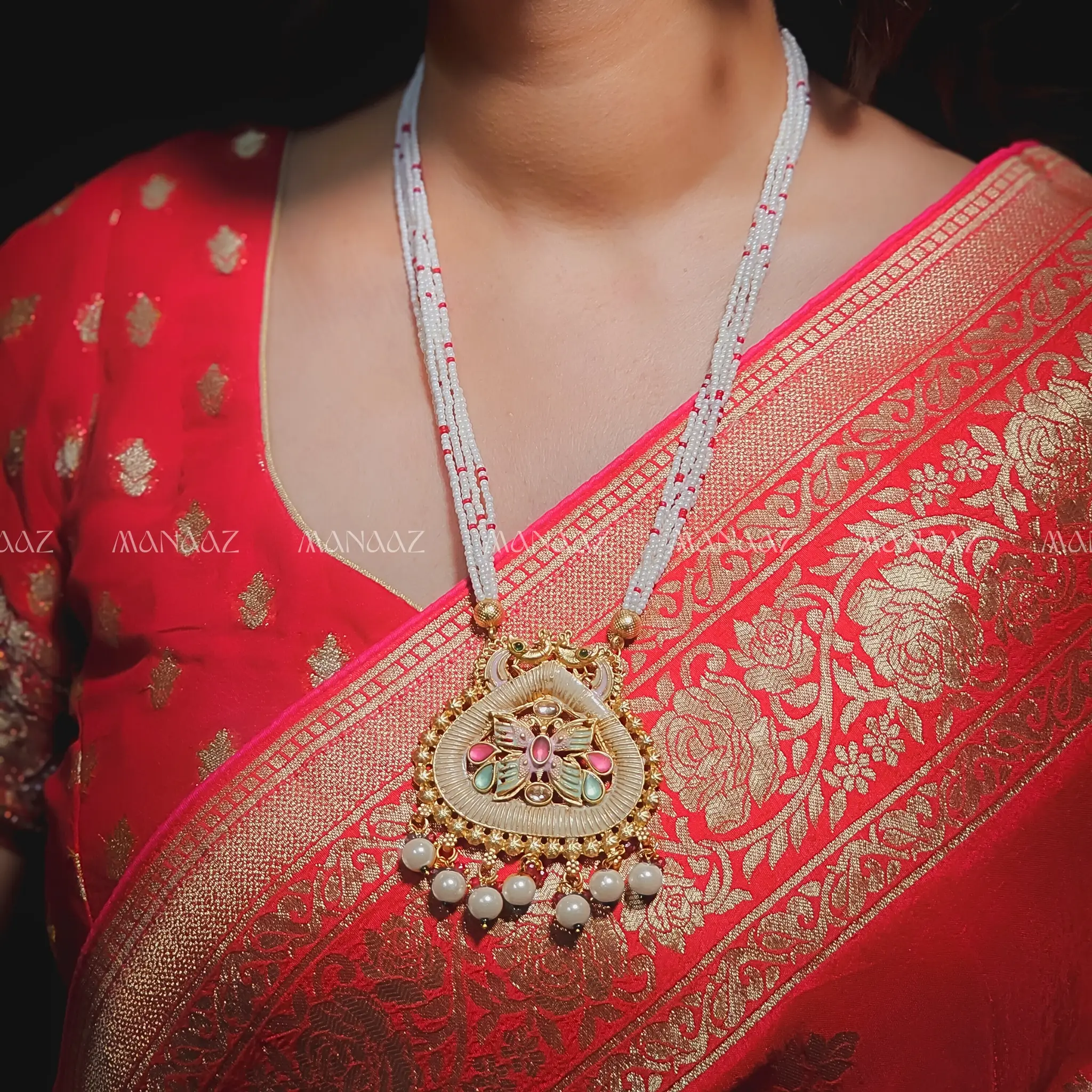Step into a world of timeless allure with our Meenakari Mughal Pearl Long Set. This exquisite ensemble features a majestic, antique gold-finished pendant, intricately adorned with vibrant Meenakari enamel work in soft hues of red, green, and cream, evoking the grandeur of Mughal artistry. The detailed craftsmanship captures a delicate floral motif, highlighted by subtle stone embellishments. From its scalloped base, a playful fringe of lustrous faux pearls dangles, adding graceful movement. The pendant is beautifully suspended from multiple strands of delicate faux pearls, creating a rich, textured neckline. Completing the set, the matching earrings mirror the pendant’s ornate design, featuring complementary Meenakari work and gentle pearl drops. This set is a celebration of heritage, perfect for those seeking traditional elegance with a refined and regal touch for weddings, festive occasions, or cultural events.