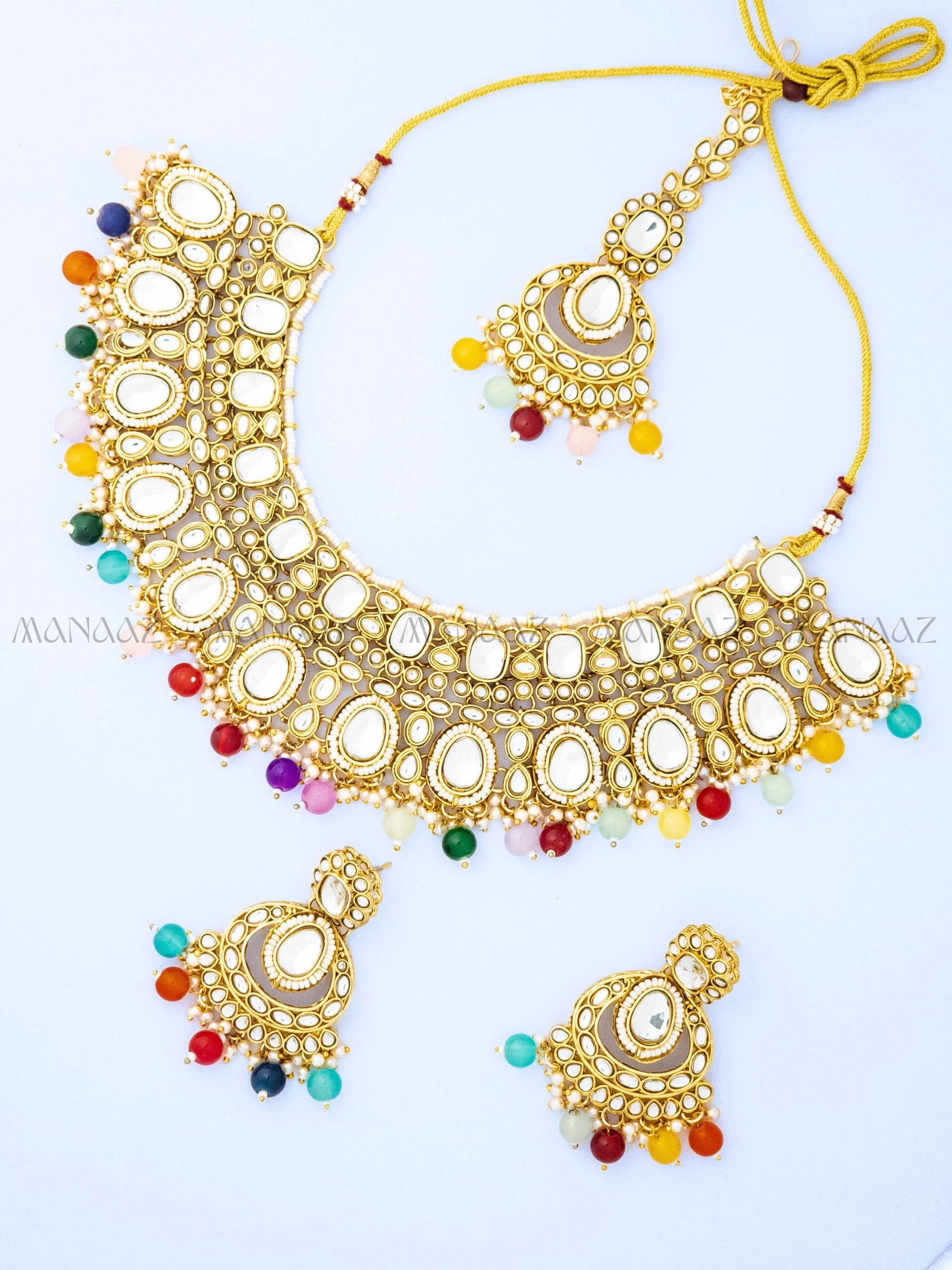 What truly sets this piece apart is the delicate row of multicolour bead drops, inspired by the nine sacred gemstones (Navratna), symbolizing prosperity, balance, and joy. The matching earrings echo the same regal detailing, creating a harmonious and statement-worthy ensemble.