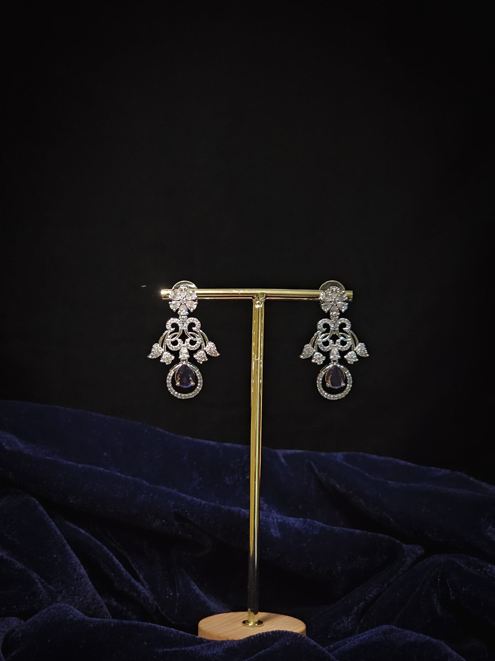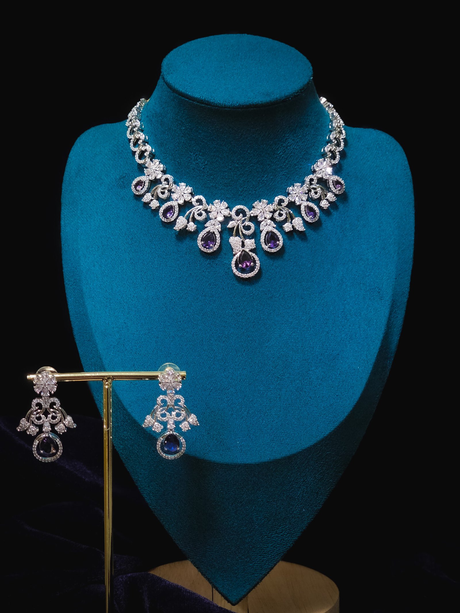 This necklace set is crafted with premium-quality alloy and finished with a fine silver plating that enhances its brilliance. The design is adorned with sparkling CZ (American Diamonds) that add a radiant shine, while the deep amethyst-purple stones at the center bring a royal touch. It is skin-friendly, durable, and carefully designed to maintain its long-lasting shine and elegance.