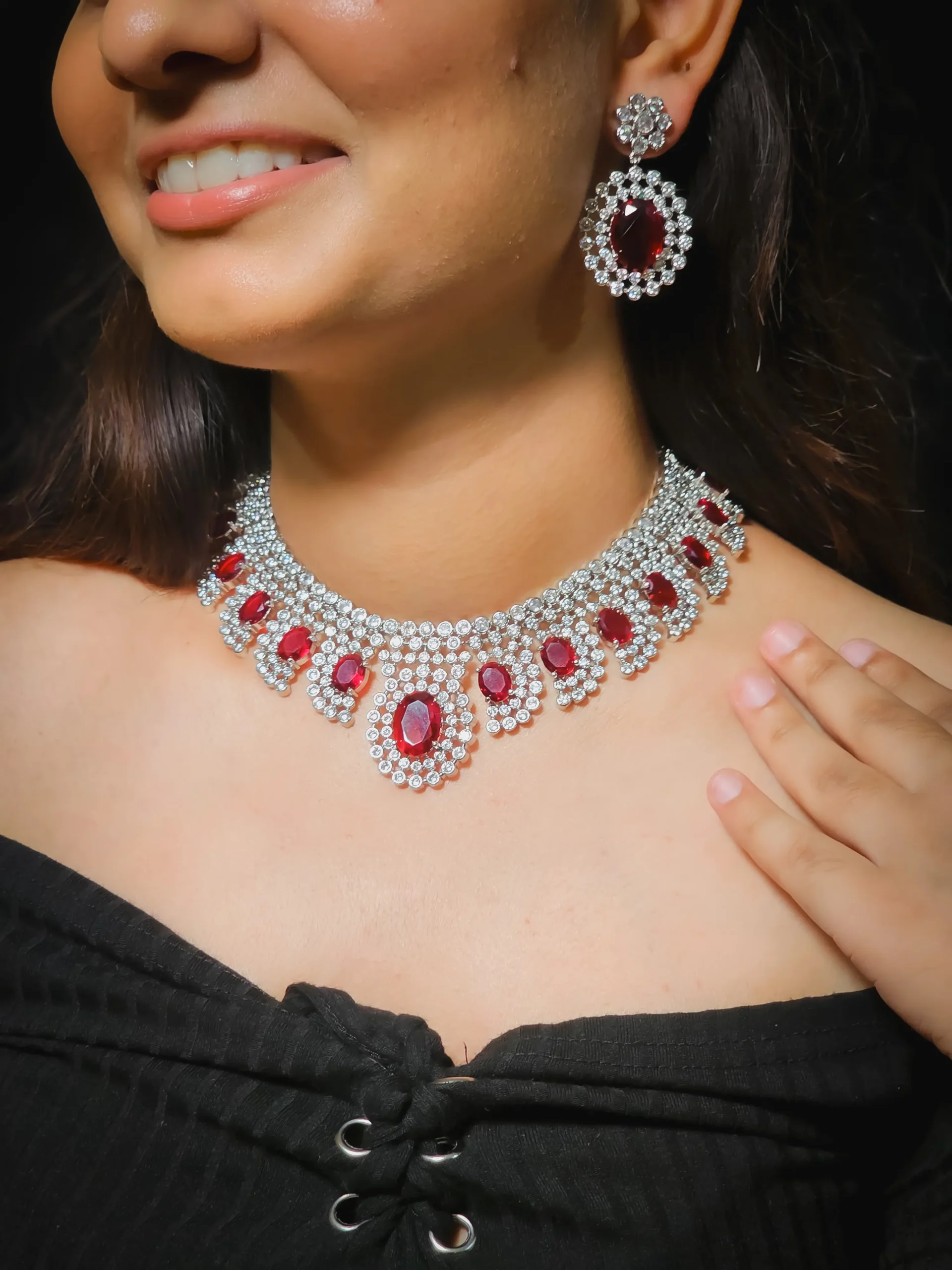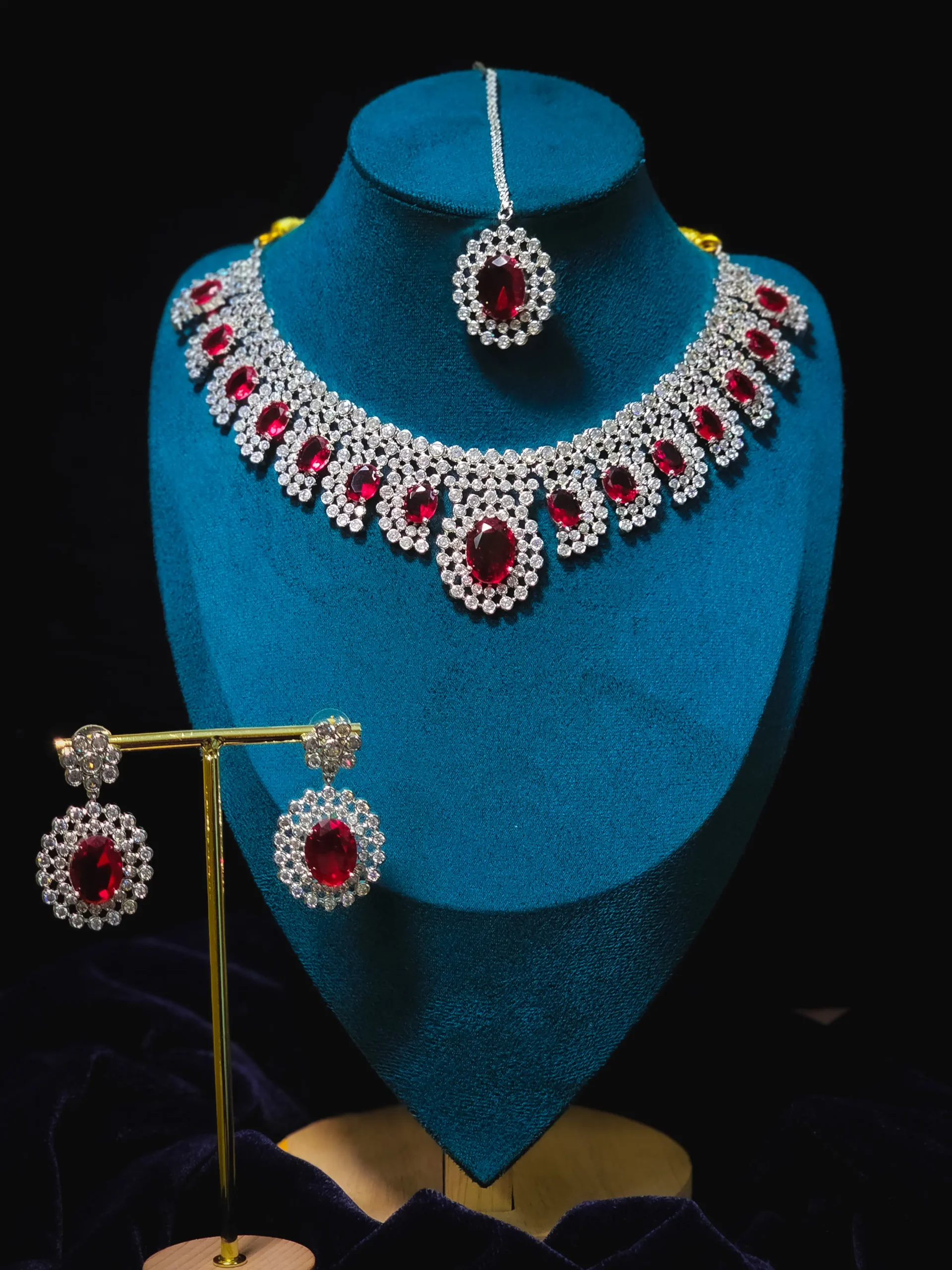 Step into the spotlight with this majestic imitation jewellery set, a true symbol of regal elegance. This stunning set features a classic necklace with large, deep red stones surrounded by halos of brilliant American Diamonds, complete with matching earrings and a maang tikka. Its rich design and sparkling finish are perfect for making a grand statement.