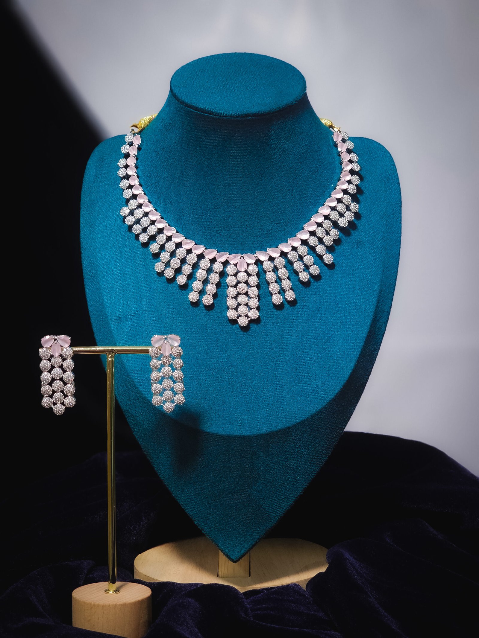 This delicate and enchanting jewellery set captures a soft, feminine elegance. It features a unique necklace with a graceful collar of shimmering rose pink stones and a brilliant fringe of multi-layered American Diamond drops. The matching earrings complete this sophisticated and modern look, making it a perfect accessory for any special event.