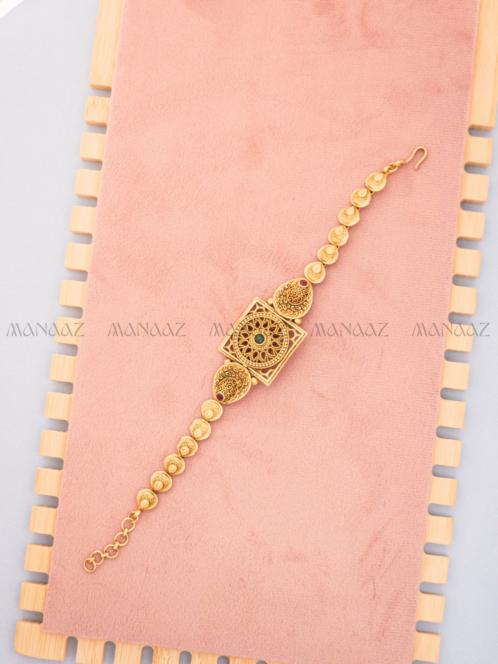 The Padma Rajwadi Copper Bracelet is a striking imitation piece that celebrates the timeless beauty of traditional Indian motifs with a sophisticated, wearable design. This bracelet features a magnificent central square motif meticulously etched with intricate filigree work and bordered by delicate, small gold-tone beads. At its heart, a single emerald-green imitation stone provides a beautiful, regal focus. The rest of the band is composed of smooth, polished gold-tone beads, giving it a rich texture and comfortable weight. This piece offers a heritage, heirloom-quality look in a modern bracelet format, making it the perfect statement accessory to complete any festive or formal ethnic ensemble.