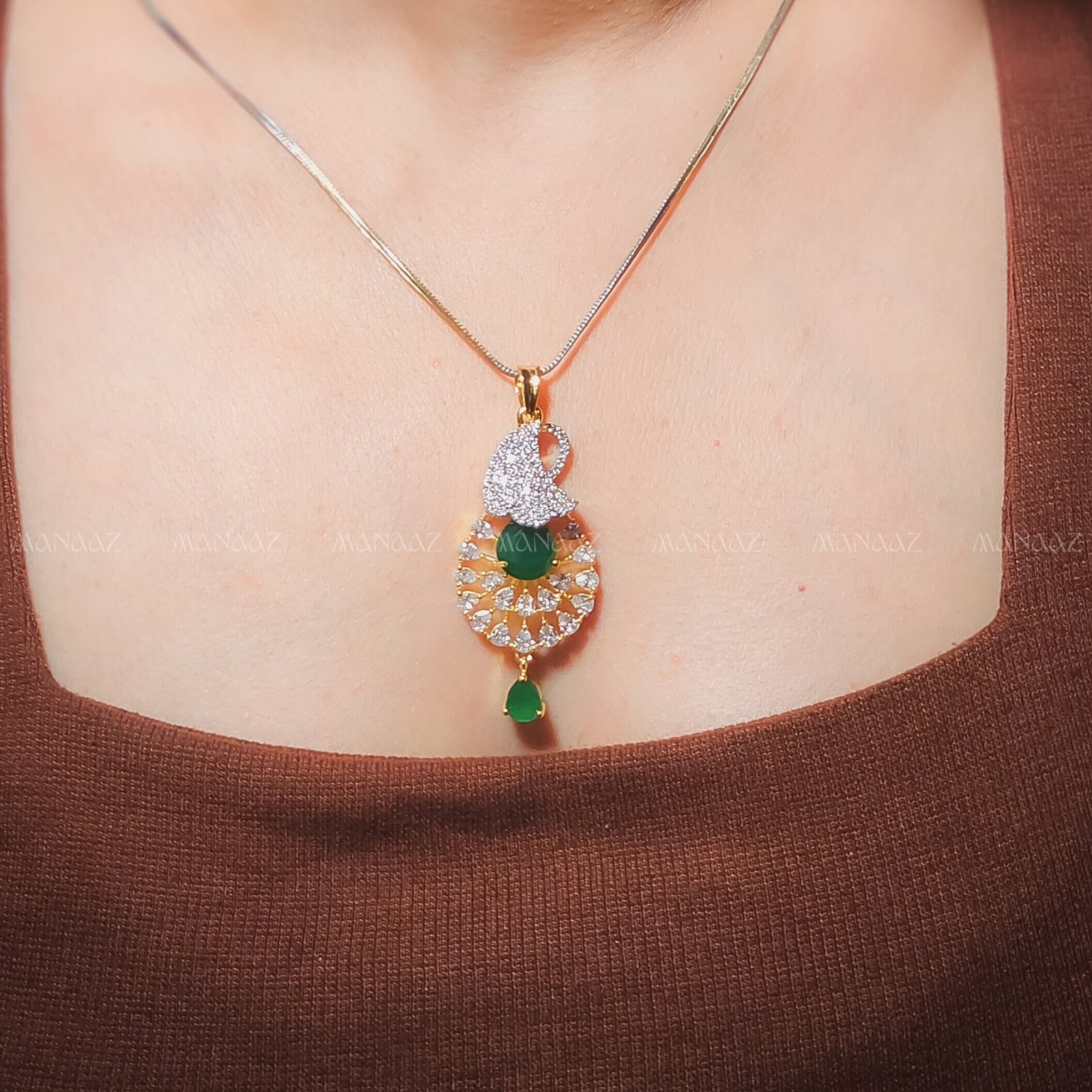 Emerald Noor Pendant — a masterpiece that blends traditional craftsmanship with modern sophistication. Adorned with brilliant white stones, vivid emerald-green accents, and a graceful teardrop design, this pendant symbolizes elegance, prosperity, and poise.