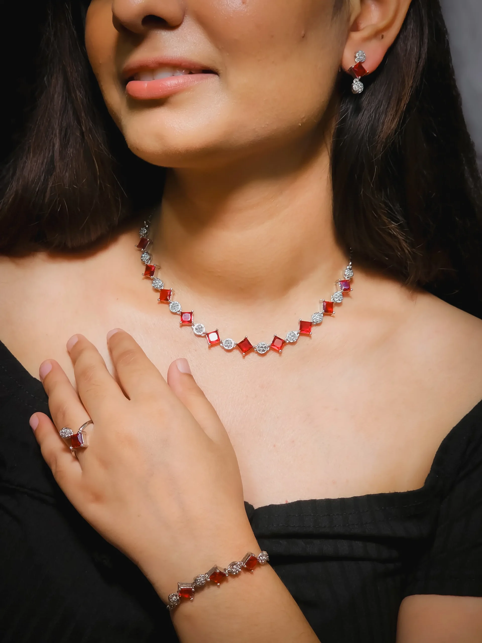 Royale Jewellery Combo Set, a breathtaking combination of passion and poise. This exquisite set, featuring a radiant necklace, bracelet, and matching ring, showcases brilliant red square-cut stones framed with sparkling American diamonds — a perfect blend of tradition and modern grace.
