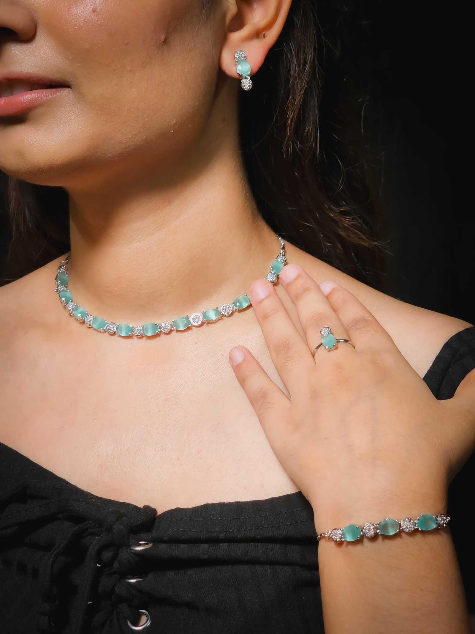 Grace Jewellery Combo Set, a perfect harmony of tradition and modern artistry. This stunning set includes a necklace, bracelet, and matching ring, beautifully adorned with aqua-green and white American diamonds that capture light with every movement.