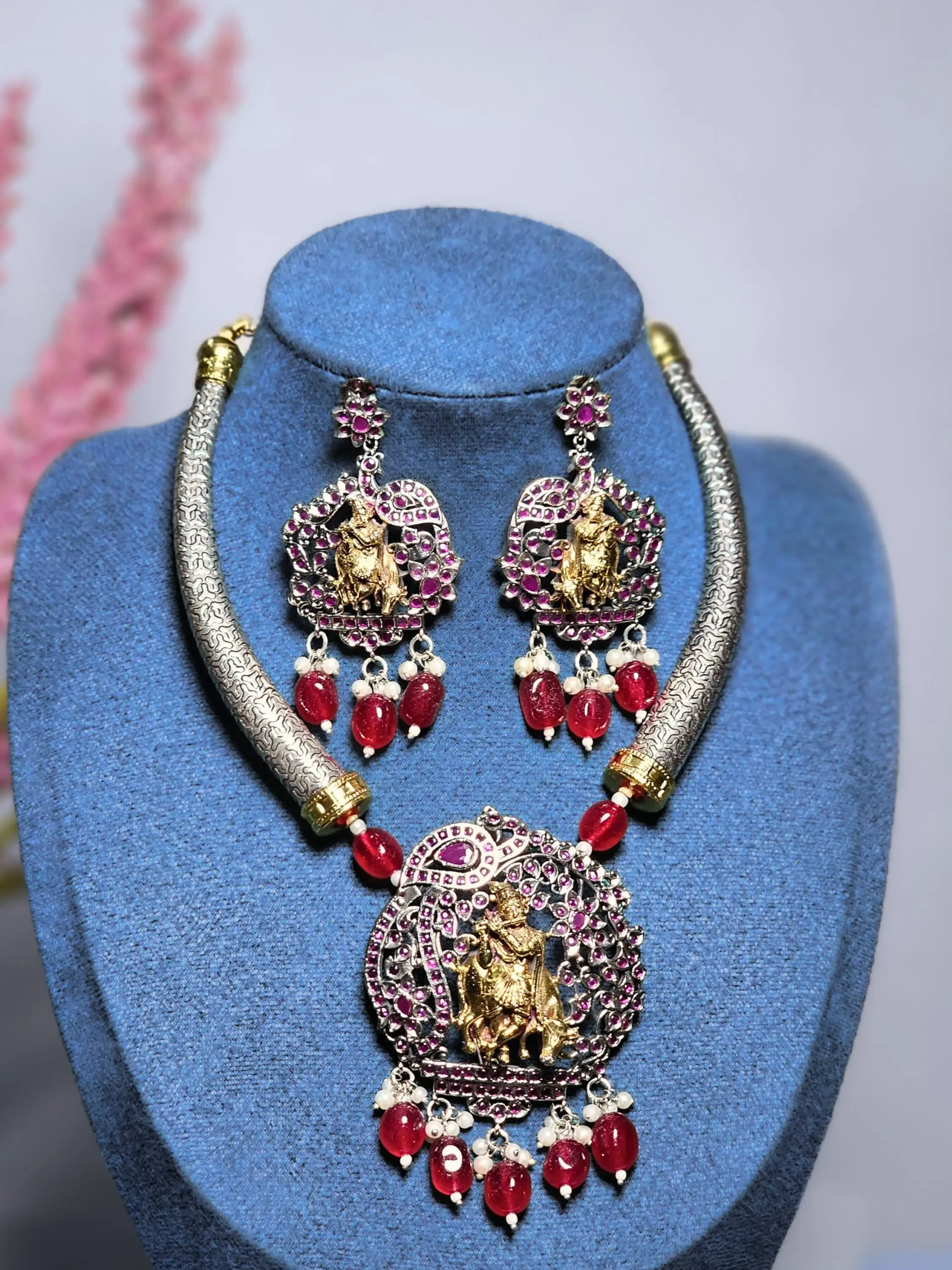 Inspired by royal temple artistry, this Rajwada Krishna kundan necklace set blends traditional detailing with bold red accents—perfect ethnic jewellery for festive and wedding looks.
