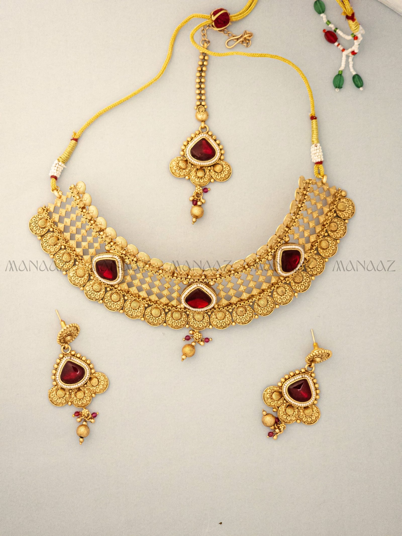 The Rakta Jaali Collar Ensemble is a regal and intricate set that blends traditional antique gold-tone metalwork with the rich color of ruby. This curved Collar Necklace features a wide, structured band composed of delicate gold-tone Jaali (net/mesh) work that provides a rich, textured foundation. Across the center, five prominent teardrop-shaped ruby-red imitation stones are beautifully bezel-set and spaced evenly, creating a striking focal point. The lower edge of the necklace is bordered with a fringe of ornate, textured medallions. The set is completed with perfectly matched drop earrings and a coordinated Maang Tikka (forehead pendant), all featuring the prominent ruby-red teardrop stone and antique metalwork. This ensemble offers a complete, majestic, and traditionally rich look, perfect for grand occasions.