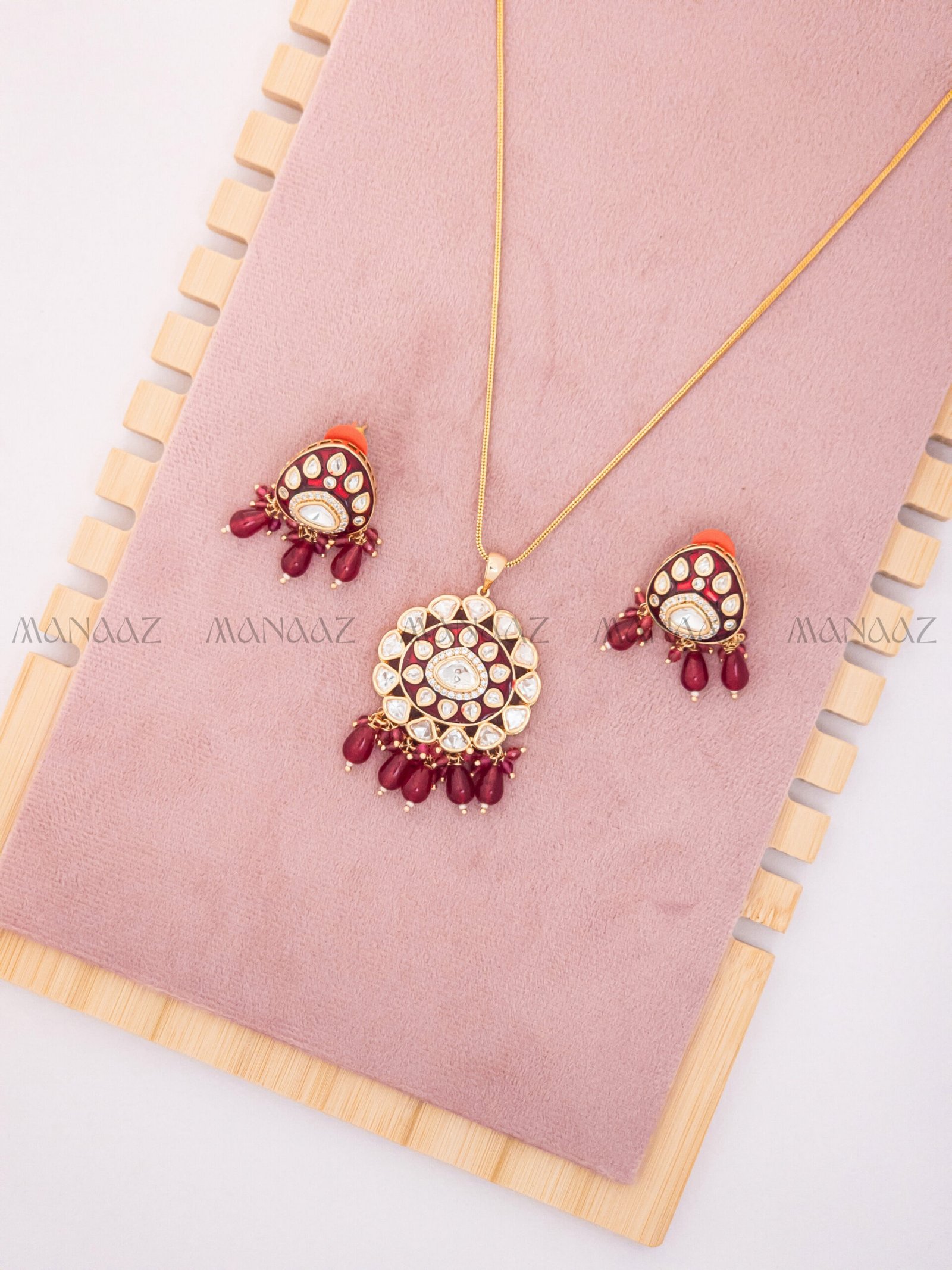 The Rakta Kamal Kunda Pendant Set is a magnificent piece of imitation jewelry that beautifully marries the traditional allure of Kundan work with a vibrant burst of ruby-red. This elegant necklace features a fine gold-tone chain suspending a prominent circular pendant. The pendant boasts a central, luminous Polki-style imitation stone (faux Kundan) surrounded by a halo of smaller white stones and intricate detailing, all framed by a striking border of rich ruby-red accents. A lavish fringe of polished, deep ruby-red bead drops hangs from the bottom, adding movement and traditional opulence. The perfectly matched earrings echo the same circular motif with Kundan, ruby accents, and a fringe of ruby beads, creating a cohesive and glamorous ensemble perfect for festive or formal occasions.