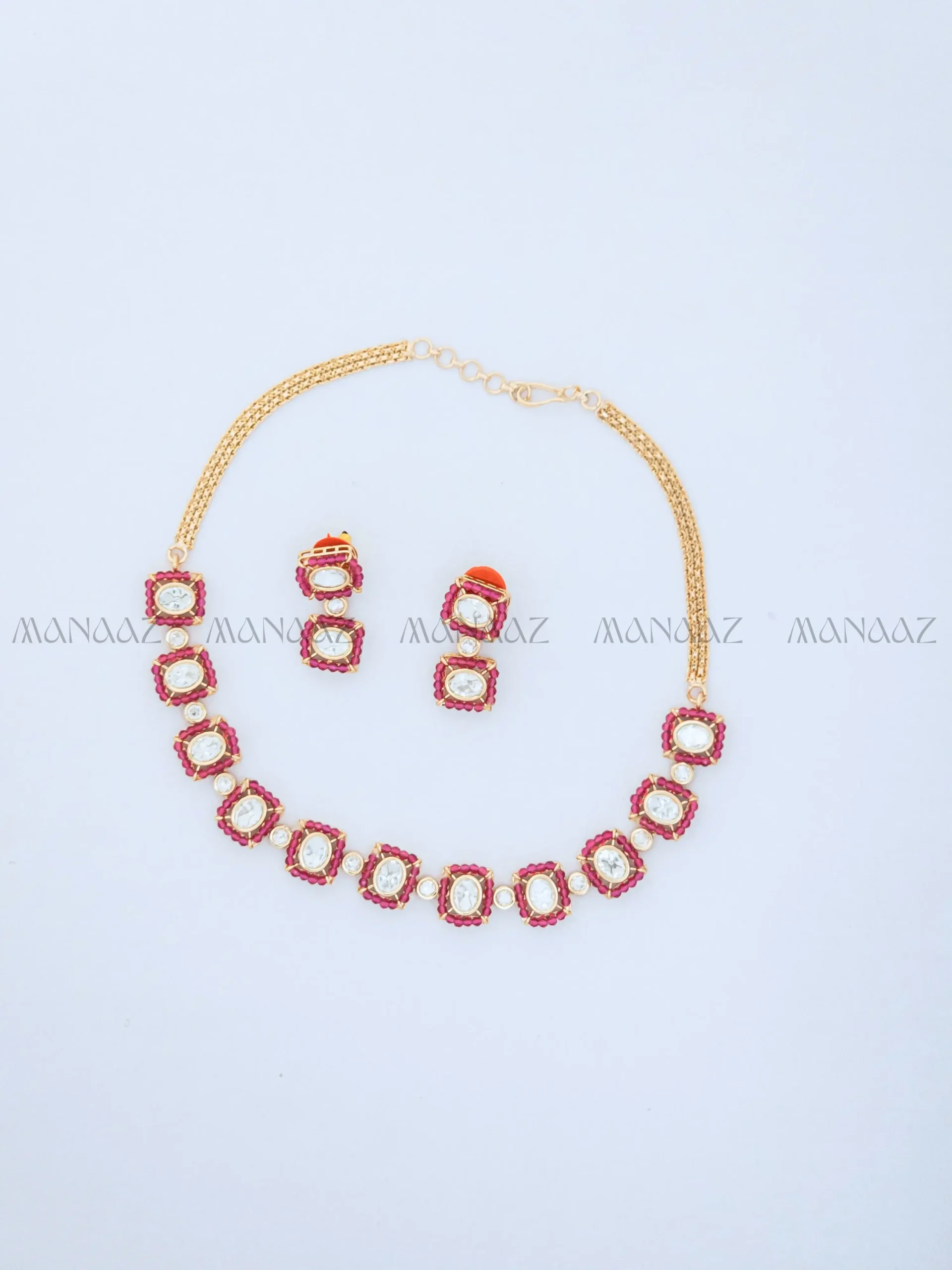 The Ruby-Lotus Mozonite Necklace Set is a striking piece of imitation jewelry that delivers a magnificent combination of traditional Kundan work with a clean, contemporary design and a bold ruby accent. This sleek necklace and earring set features repeating square frames set with luminous, opaque Polki-style imitation stones (faux Kundan). The traditional stones are surrounded by a brilliant halo of small, deep ruby-red imitation stones, giving the set a rich, luxurious border and a high-impact color contrast. The necklace hangs from a modern, flat gold-tone chain, perfectly balancing the intricate stone work with a minimalist, elegant silhouette. This is the perfect statement piece for those who love traditional sparkle but prefer a modern, structured look.