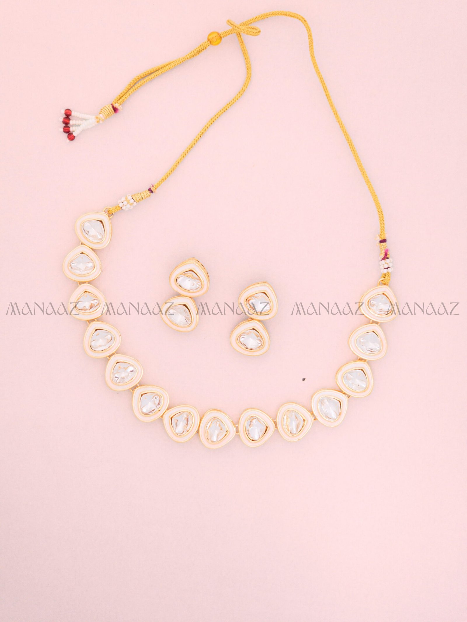 The Triangula Kundan Choker is a stunning piece that delivers the classic, luminous elegance of Polki-style imitation stones in a clean, contemporary design. This close-fitting choker features a continuous line of uniform, connected opaque white imitation stones, each cut into a beautiful, soft triangular or teardrop shape. The setting around each stone is deliberately thick and polished, giving the choker a substantial, authentic Kundan/Polki feel. The simplicity of the design, with no dangling drops or heavy embellishments, makes it versatile and modern. The set is completed with matching stud earrings that echo the triangular motif. This piece is perfect for adding a touch of pure, traditional luster to any ensemble, sitting gracefully just above the collarbone.