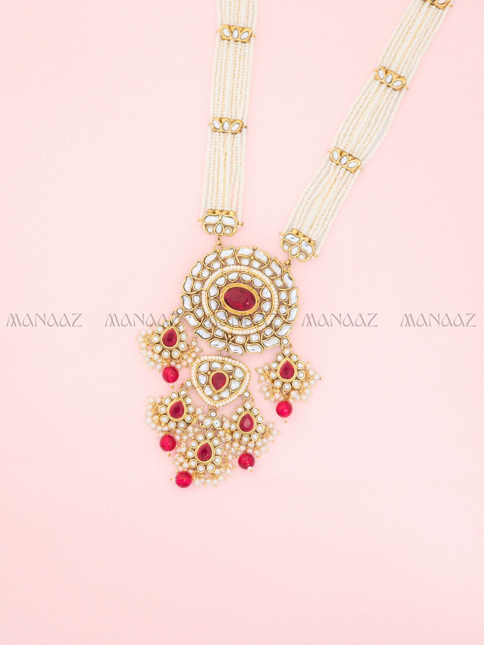 The Viridian Ratna Teardrop Ensemble is an heirloom-inspired jewelry set that balances classic Mughal geometry with vibrant, arresting color. This elegant necklace features a delicate gold-tone chain supporting a prominent teardrop-shaped pendant that is a true focal point. The surface of the pendant is luxuriously paved with luminous Polki-style imitation stones set against intricate metalwork. The entire silhouette is dramatically outlined by a precision-set border of deep, rich emerald-green imitation stones, creating a mesmerizing contrast. The set is completed with perfectly matched stud earrings that mirror the pendant’s green and white motif. This ensemble is designed for the discerning wearer, offering a refined blend of tradition and high fashion, perfect for adding a touch of regal, enduring elegance to any sophisticated look.