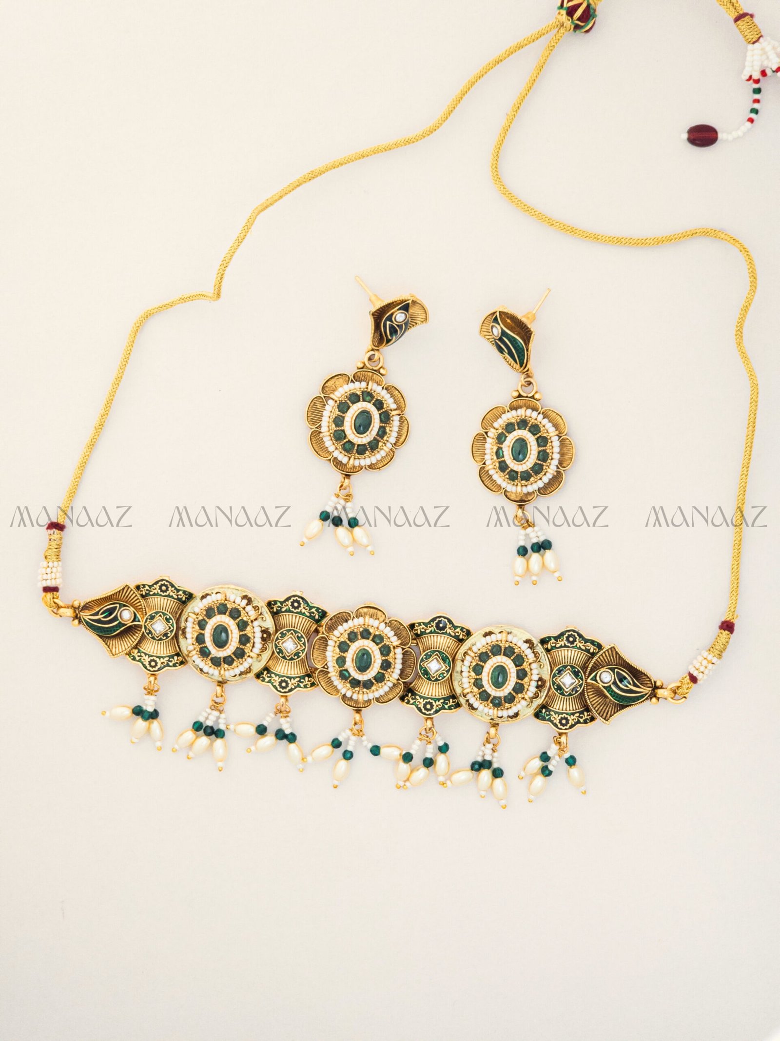 The Vriddhi Jadau Meena Choker Set is a sophisticated imitation jewelry ensemble that beautifully channels the artistry of Jadau (Kundan) work and Meenakari (enamel) detailing. This set features a flexible choker necklace composed of repeating, ornate medallions framed in a traditional gold tone. Each medallion is elegantly accented with a central deep emerald-green enamel or stone fill, surrounded by small, luminous white stones. Delicate imitation pearls and green beads dangle from the base of the choker and the matching earrings, adding classic movement and grace. This ensemble is the perfect blend of traditional elegance and fresh color, ideal for festive ceremonies and formal ethnic wear.