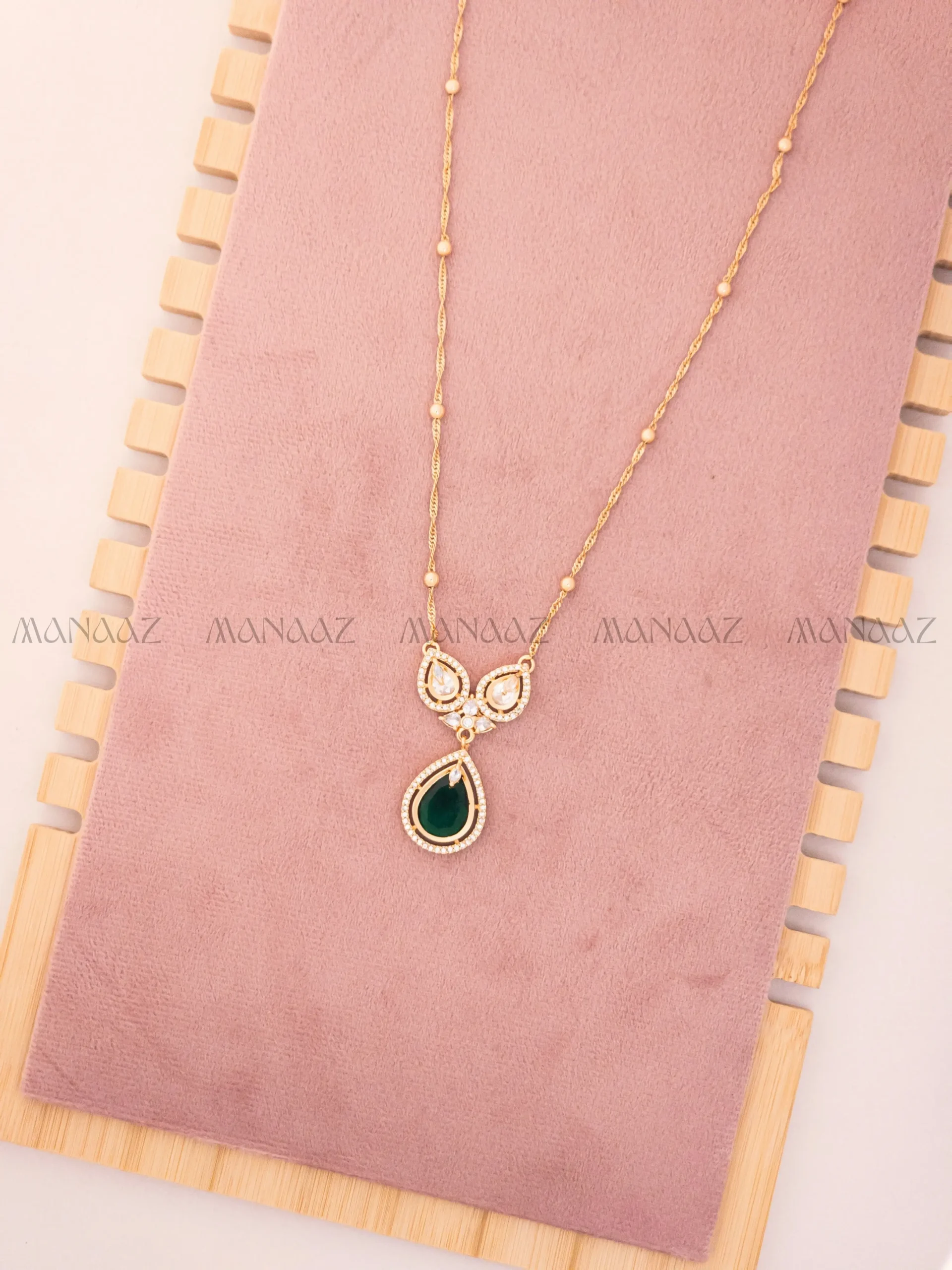 The Vrinda Emerald Drop Set is an elegant piece that achieves a perfect fusion of modern grace and traditional gemstone color. This exquisite necklace features a fine gold-tone chain supporting a delicate motif above a stunning pear-shaped emerald-green imitation stone. The top motif is a stylized cluster of shimmering clear Cubic Zirconia (CZ) or American Diamond (AD) stones, which enhance the deep, rich hue of the central emerald drop. The set’s minimalist yet sophisticated design makes the green stone the vibrant focal point. This lightweight accessory is versatile and ideal for adding a luxurious pop of color and refined sparkle to professional attire, evening wear, or light festive outfits.